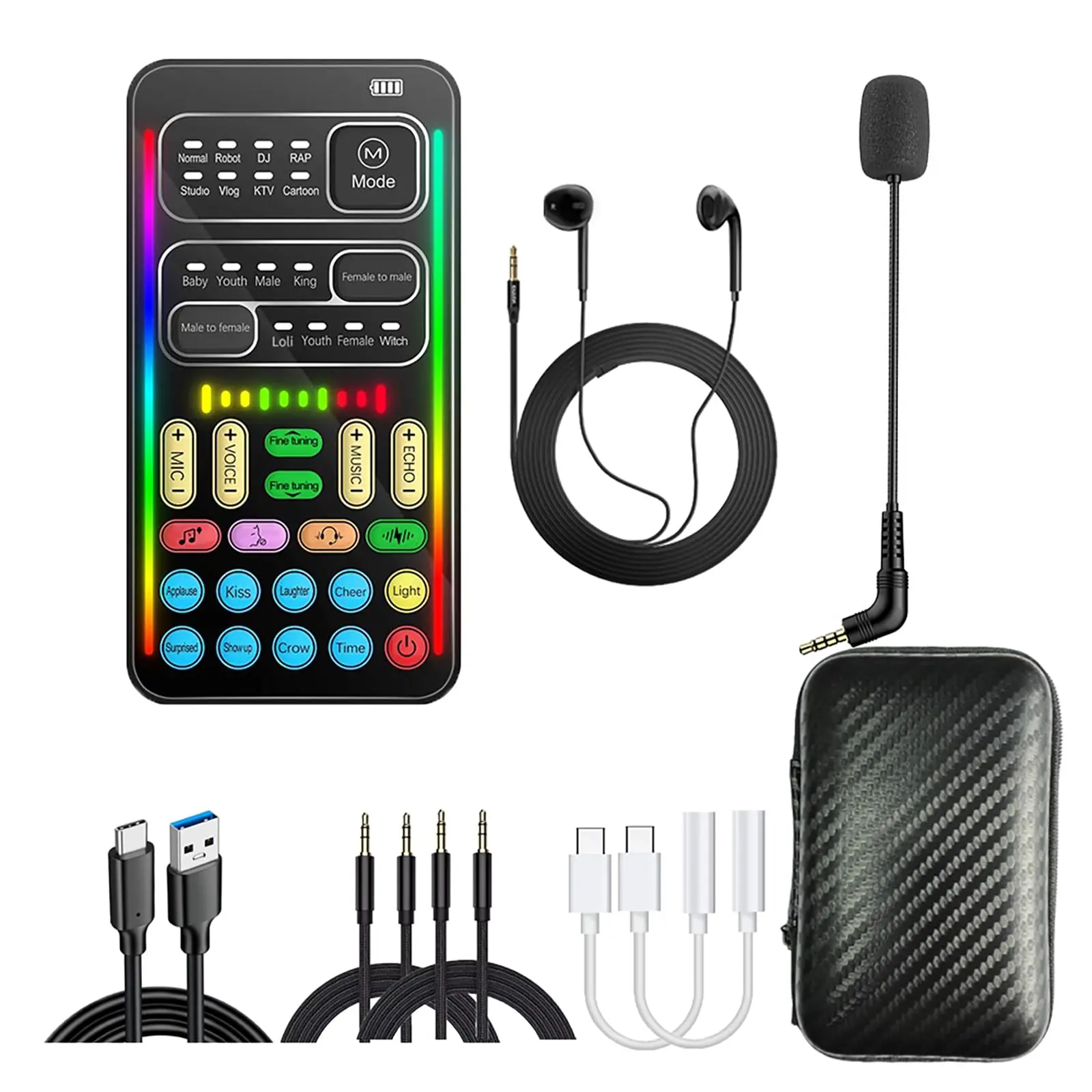 【8 Built In Sound Effects】The sound card comes with 8 interesting sound effects, you can get interesting sound effects just by pressing the of each sound effect. The eight sound effects are applause, kiss, laughter, cheerful, surprise, fright, crow, and times. The voice changer uses LED lights, which are very cool, and the lights have a separate control to turn off.