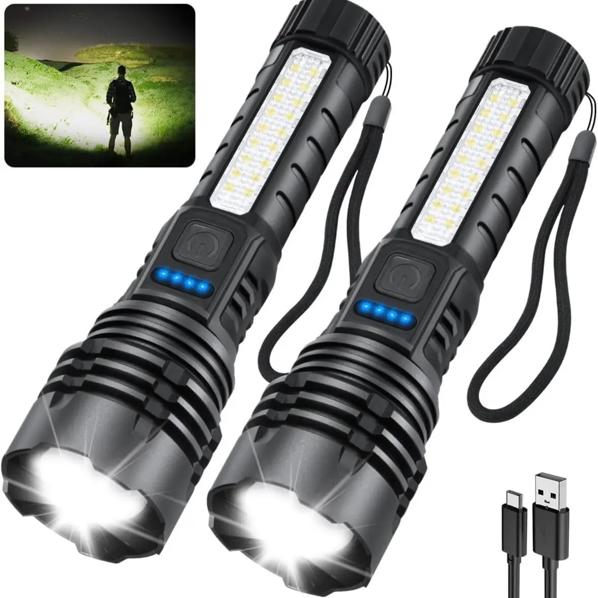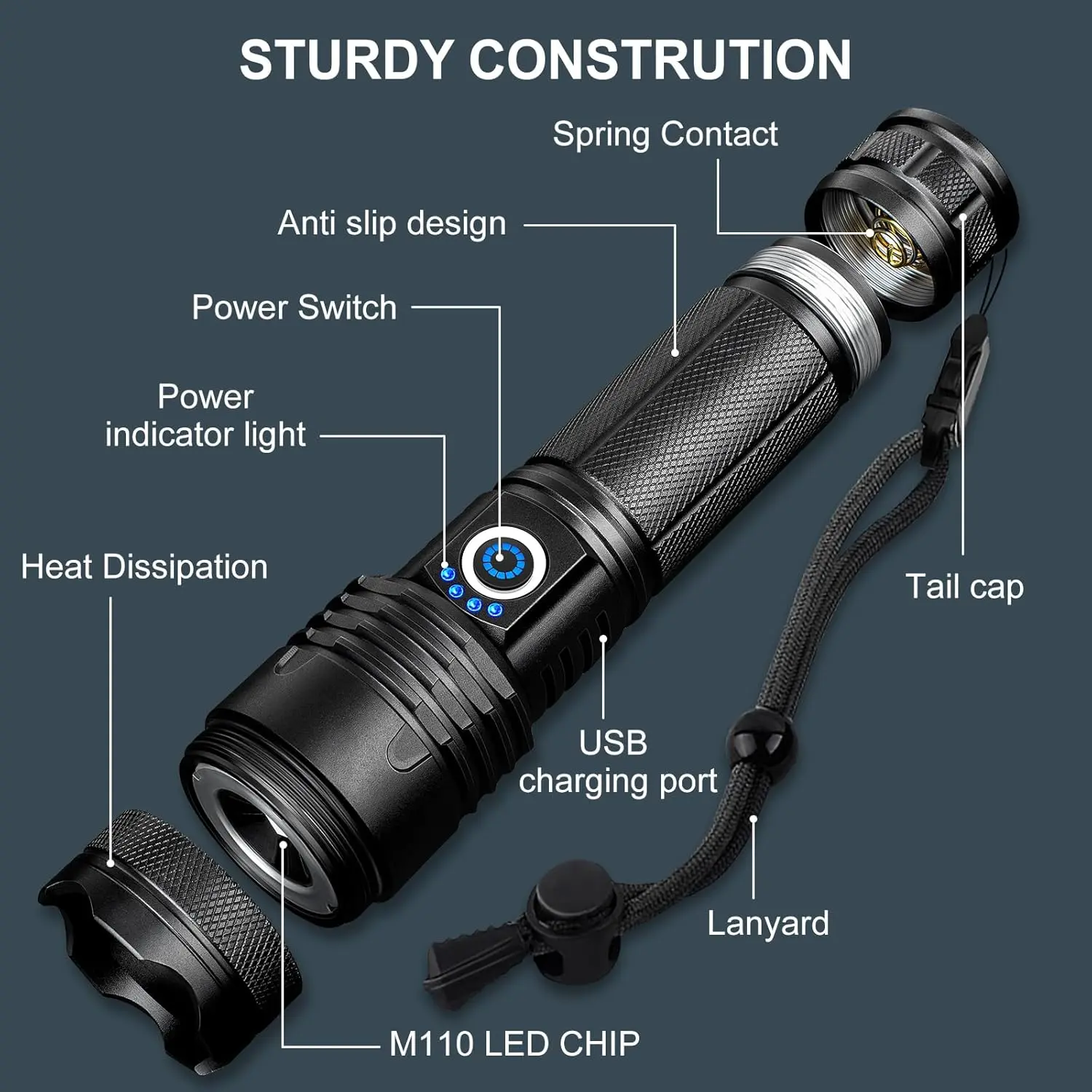 【90000 High Lumens Flashlights】The super bright flashlight build in 5000 ɱAh rechargeable ΒATTERIES and adopts the latest XHP50LED bulb, the light is uniform, it is not easy to short-circuit after long-term work. The output power up to 90000 lumens and the service life is as high as 10000 hours. The rechargeable flashlight has a range of up to 1650 feet, making it easy to light up your back garden.