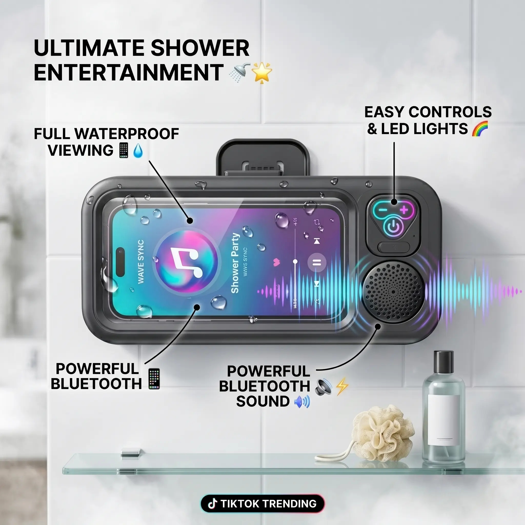 Waterproof Shower Phone Holder with Bluetooth Speaker, 360° Rotatable Wall Mount Phone Case with Touch Screen, IPX7 Waterproof Bathroom Phone Stand for Shower