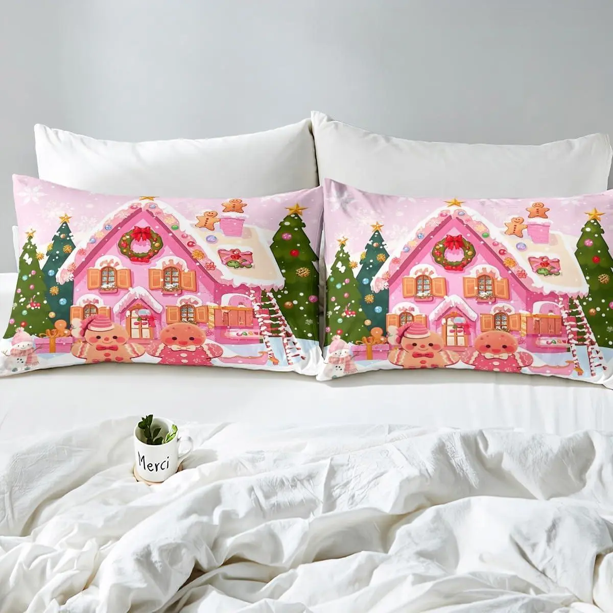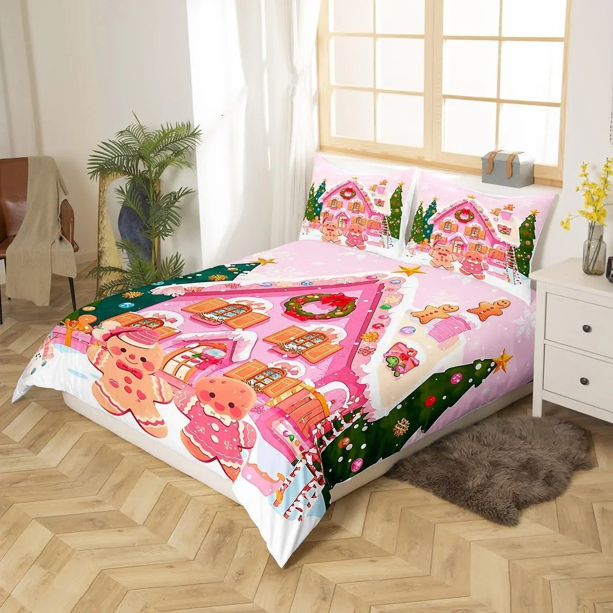 5. Pink Gingerbread House Duvet Cover (NO Comforter),Xmas Kawaii Gingerbread Man Candy Breathable Comforter Cover,Watercolor Winter Christmas Comforter Cover