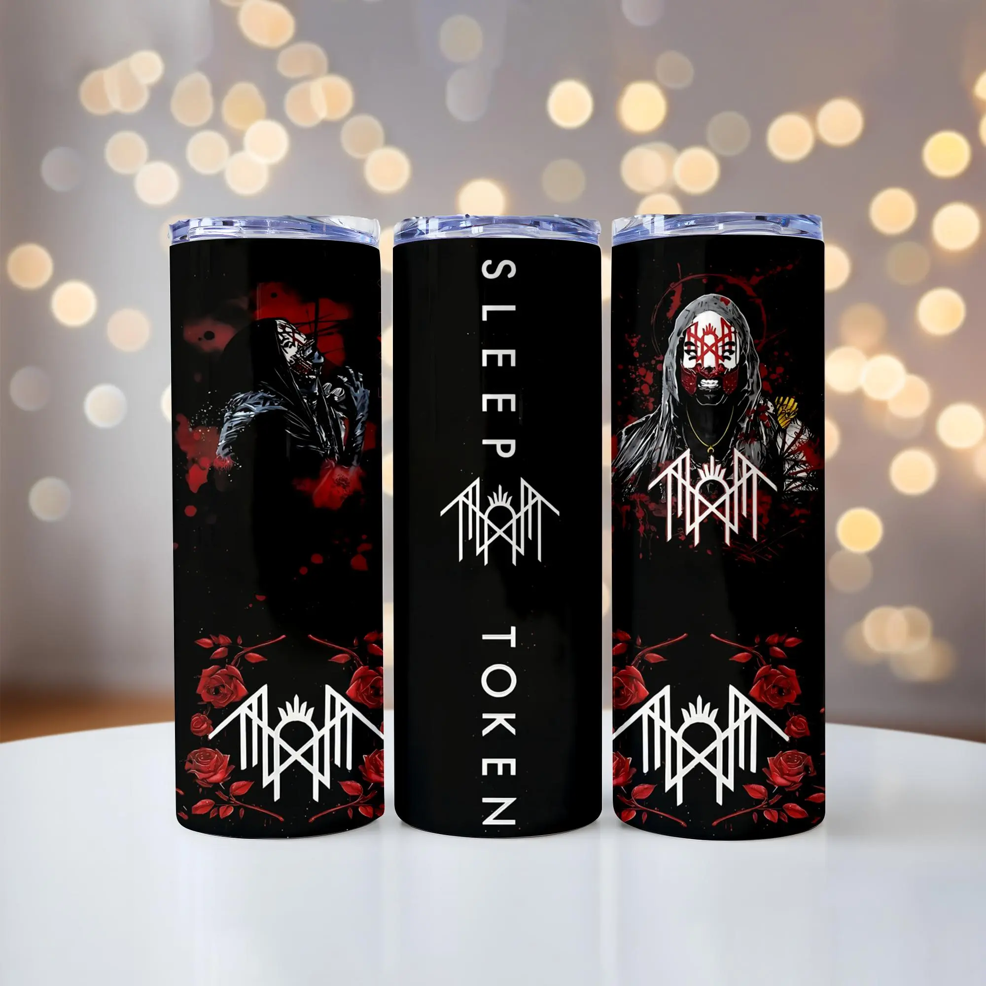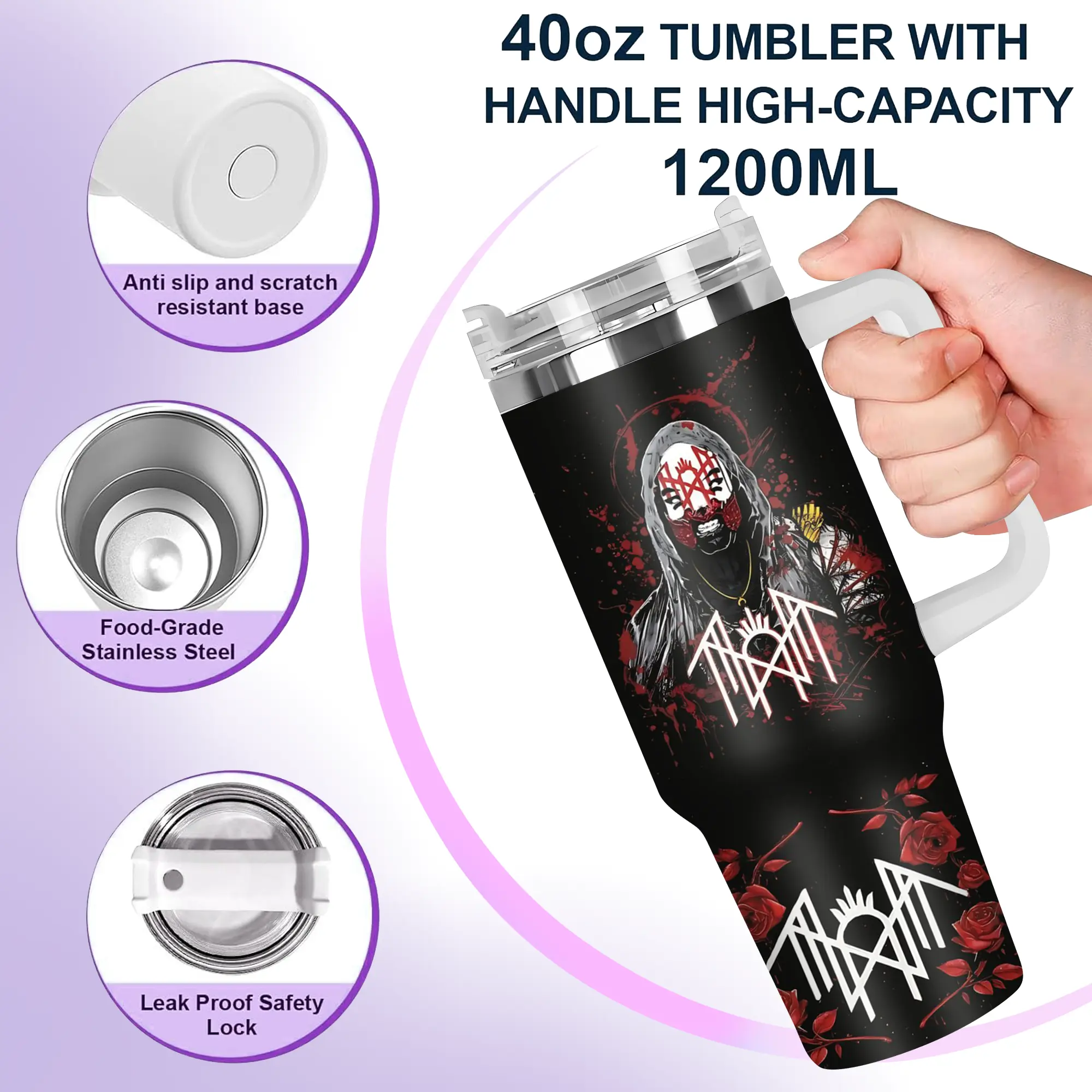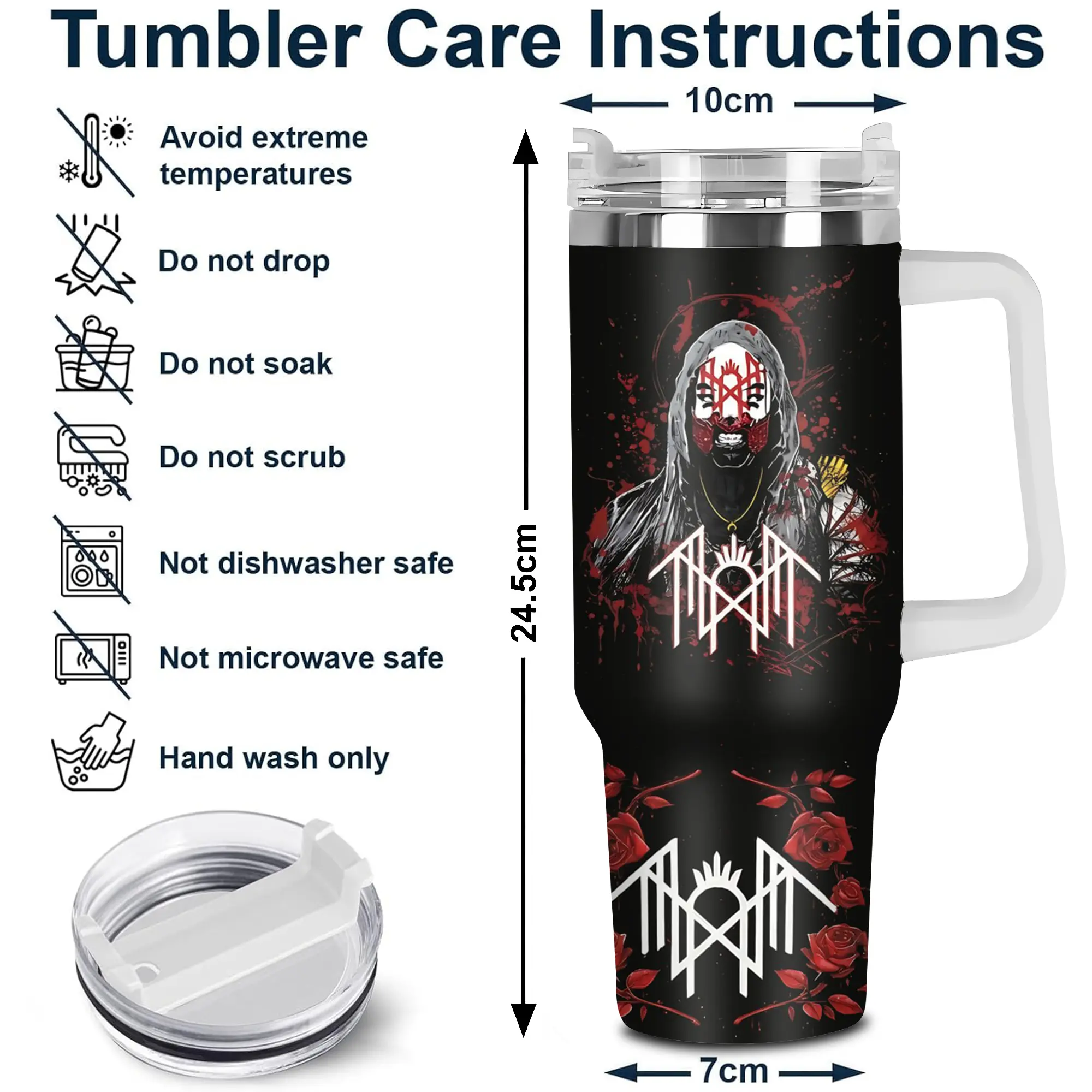5. [Elysian Sip] - Dark Masked Figure Rose Aesthetic 40oz & 20oz Stainless Steel Tumbler with Handle – Gothic Horror Insulated Mug, Red Blood Art Style Cup, Alternative Streetwear Design, Leakproof Travel Gift.