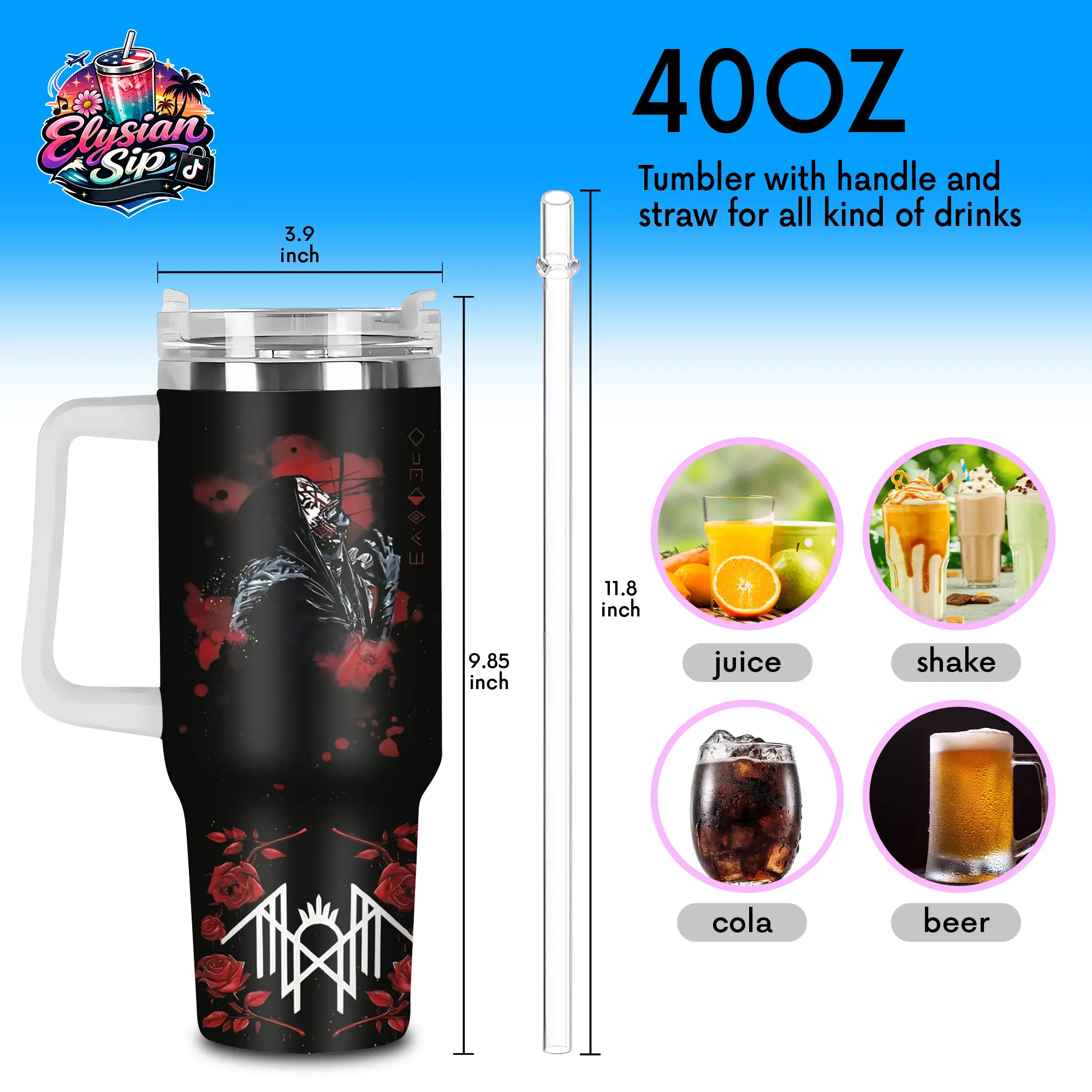 [Elysian Sip] - Dark Masked Figure Rose Aesthetic 40oz & 20oz Stainless Steel Tumbler with Handle – Gothic Horror Insulated Mug, Red Blood Art Style Cup, Alternative Streetwear Design, Leakproof Travel Gift.