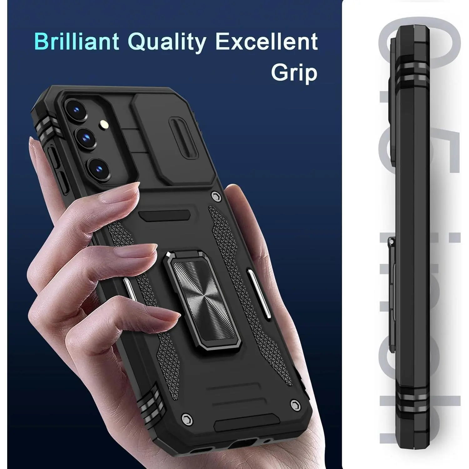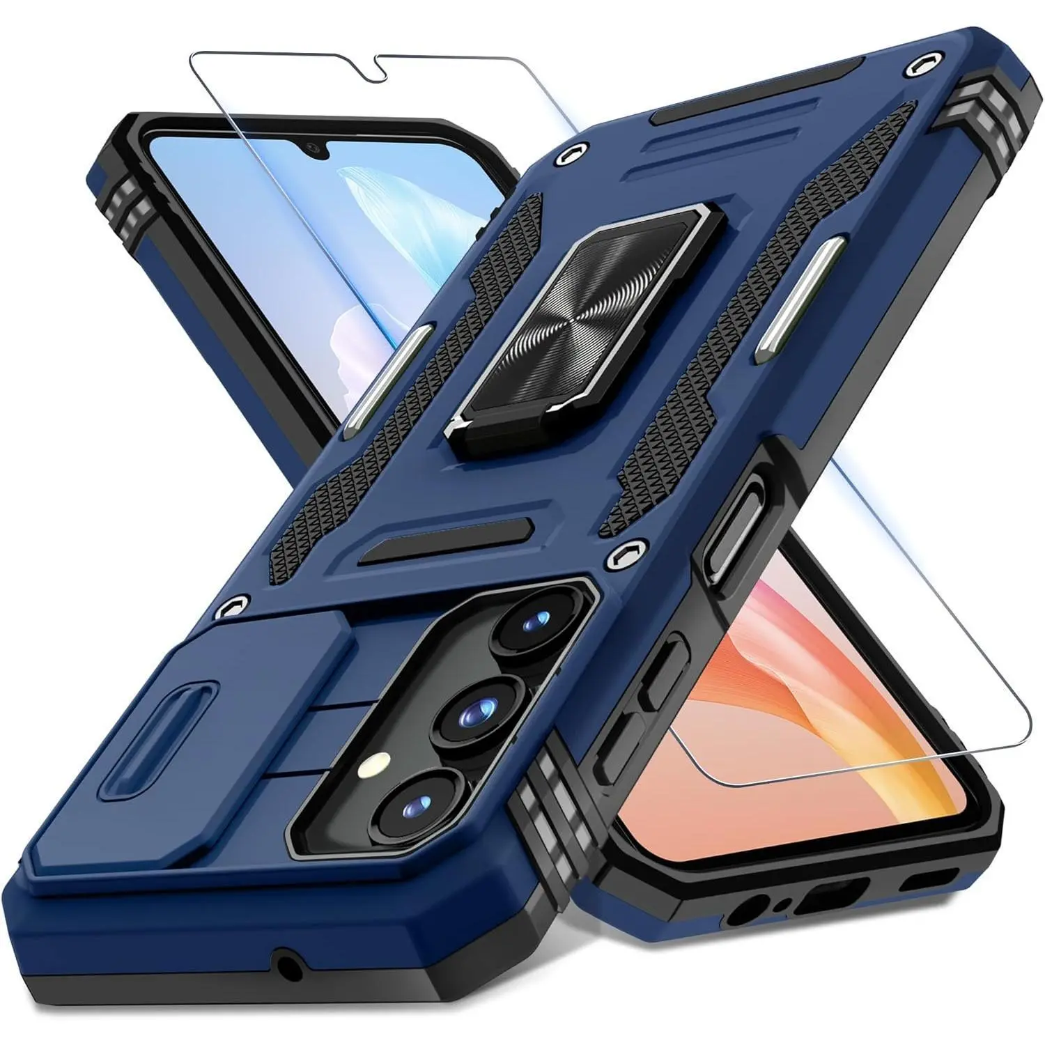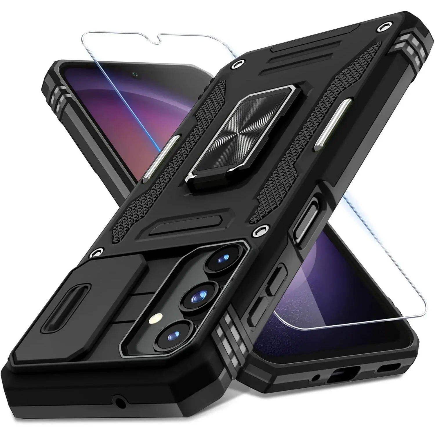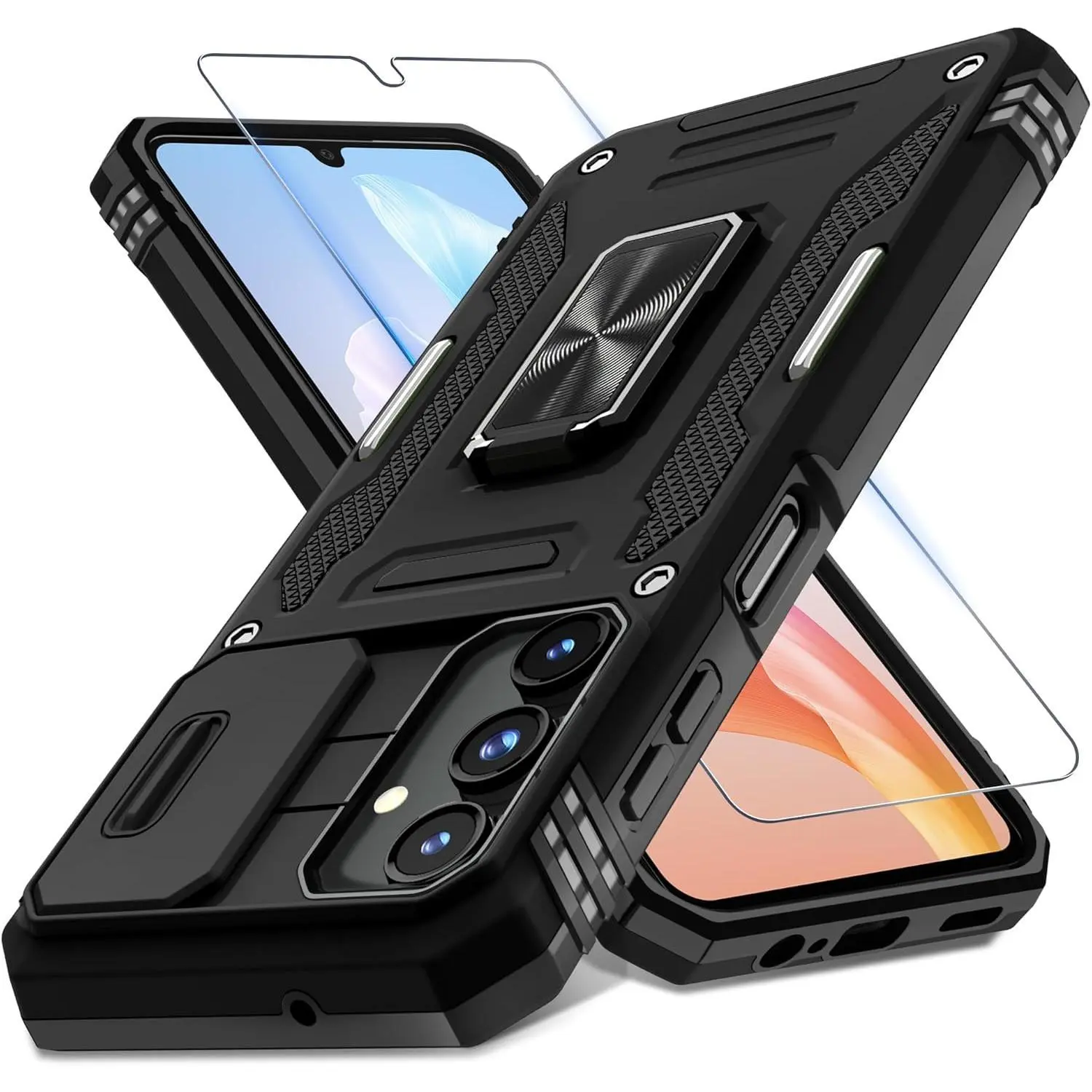 Case for Samsung Galaxy A16 5G with Slide Camera Cover+Screen Protector (1 Pack), Rotated Ring Kickstand Military Grade Shockproof Protective Cover-Black
