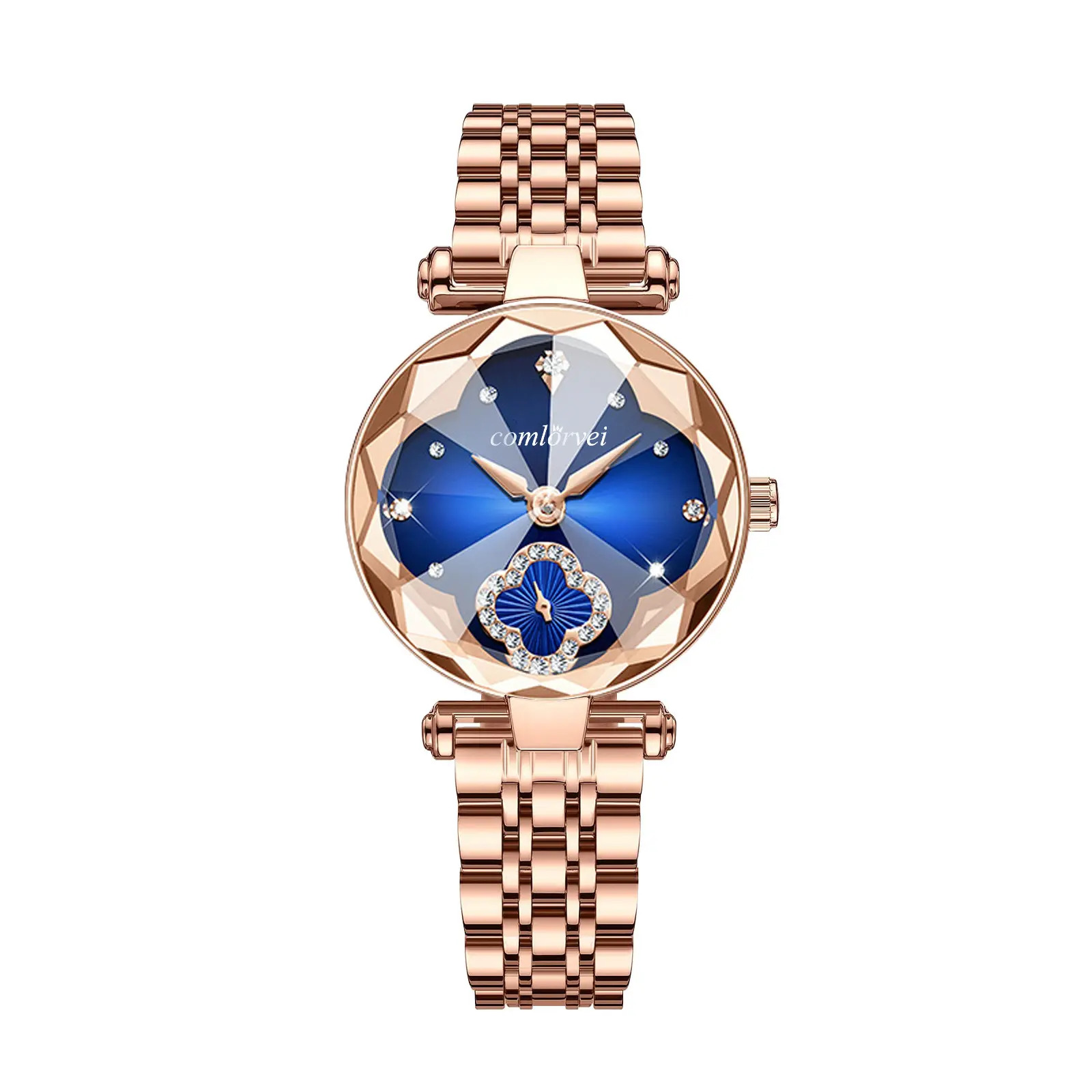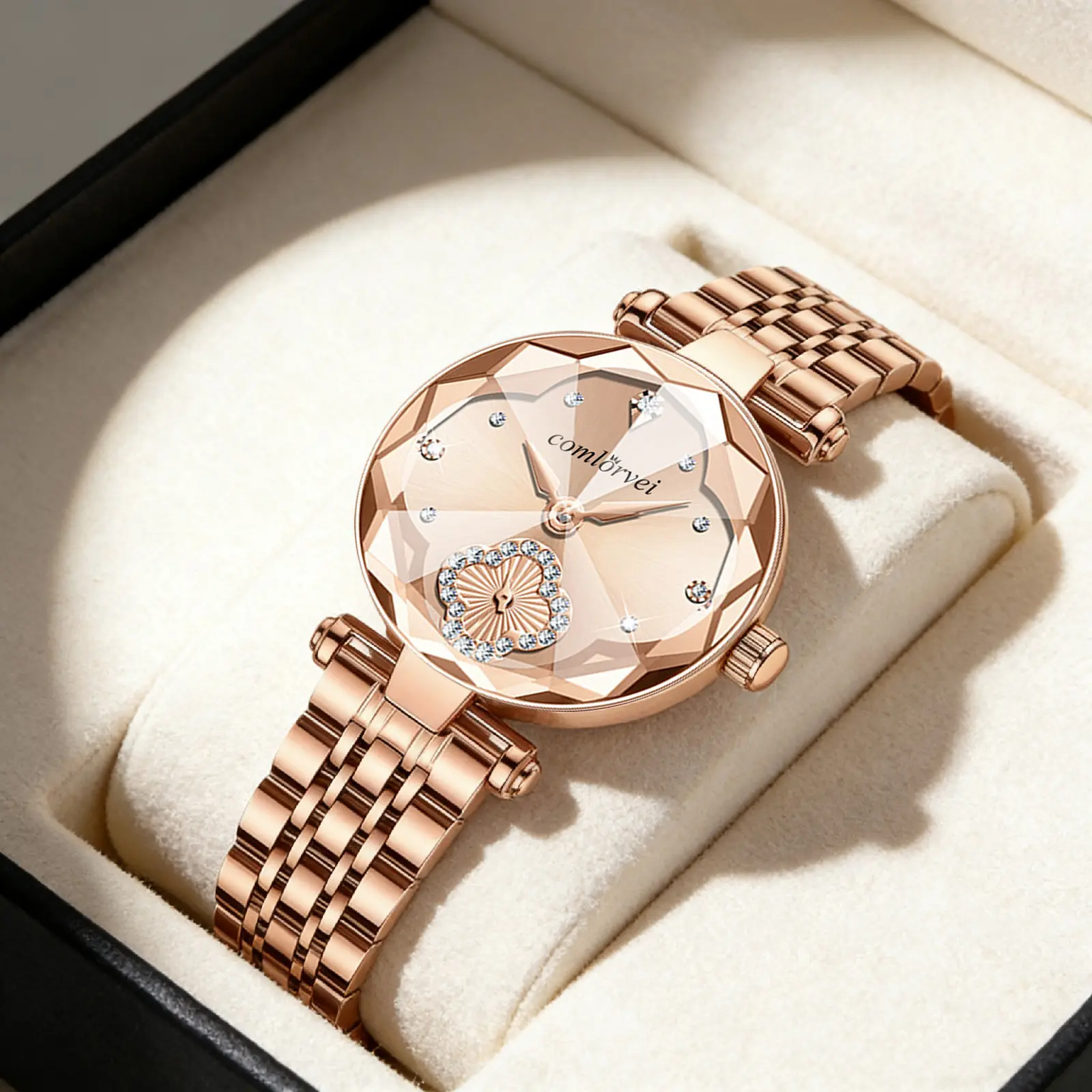 Women's Luxury Rose Gold Quartz Watch - Red Clover Dial with Crystal Accents, Diamond Flower Detail, Stainless Steel Band, Elegant Dress Wristwatch, Perfect Gift for Her