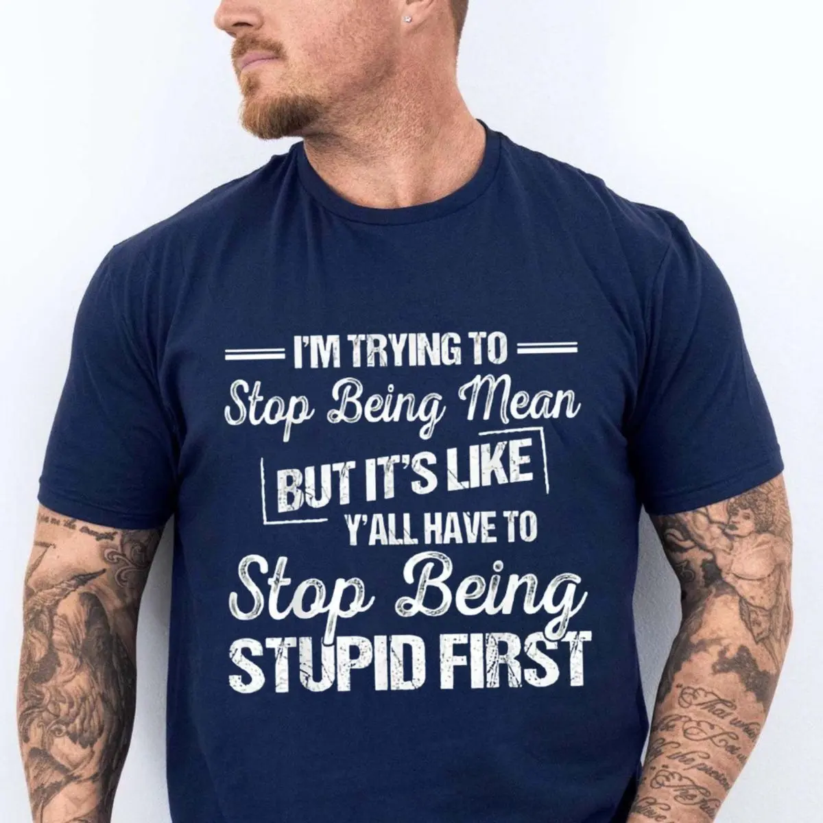 I’m trying to stop being mean but it’s like y’all have to stop being stupid first funny sarcastic quote tee, humor attitude tshirt, bold statement shirt, unisex short sleeve tee, crew neck graphic t-shirt