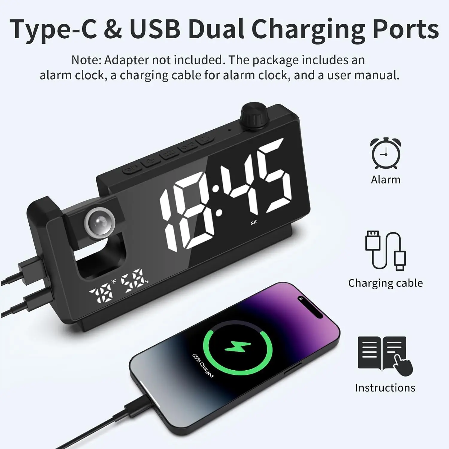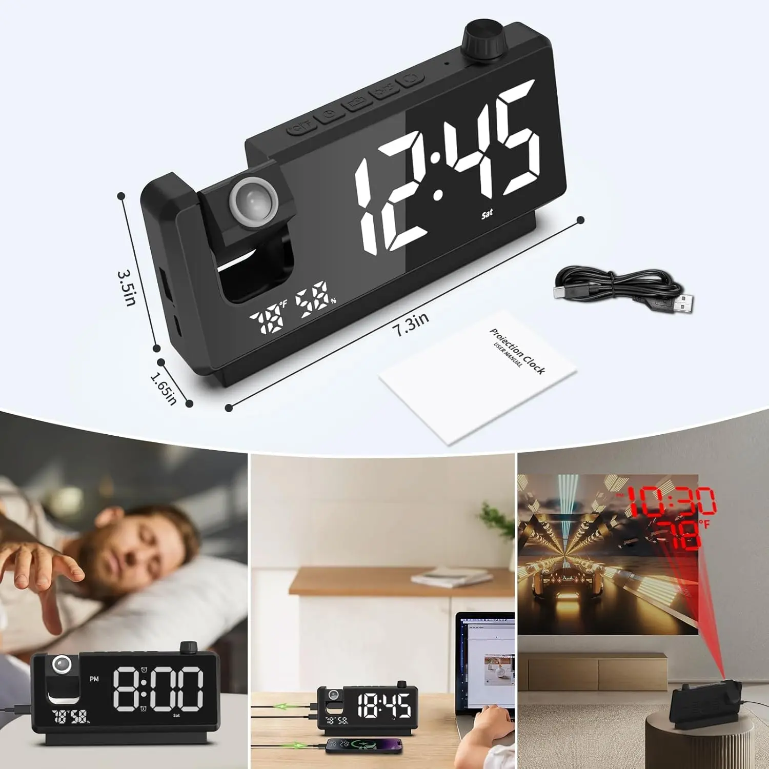 Mirror Face Projection Alarm Clock for Bedroom, Digital Clock with 180° Ceiling Projector, 3-Level Dimmer, Dual Alarm & USB Ports, Ideal Gift for Kids Elderly (Black)