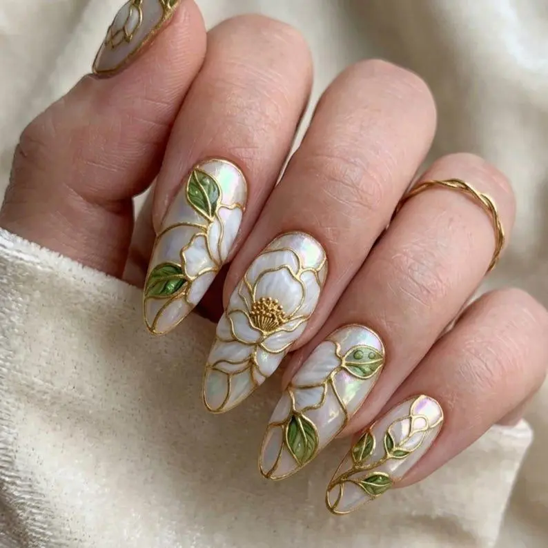 4. 3D Imperial White Camellia Stained Glass Press On Nails | Luxury Bridal Floral Nail Art