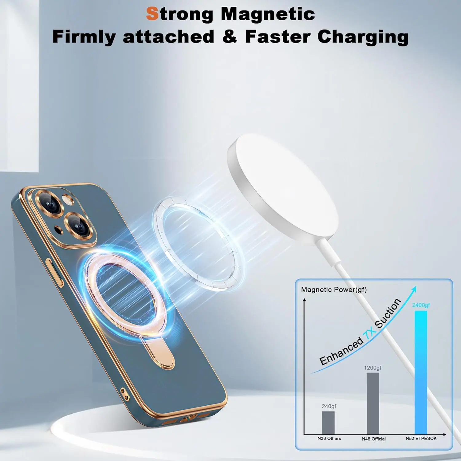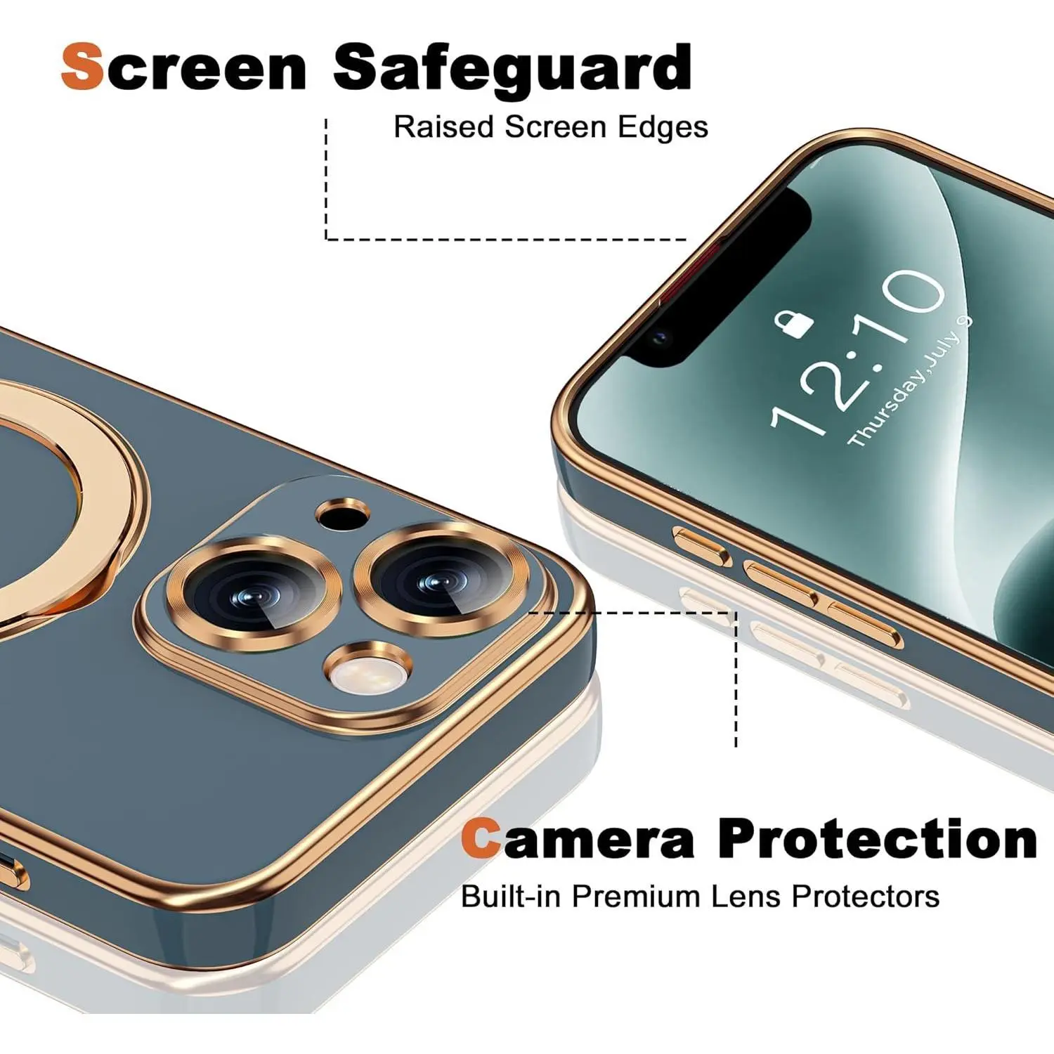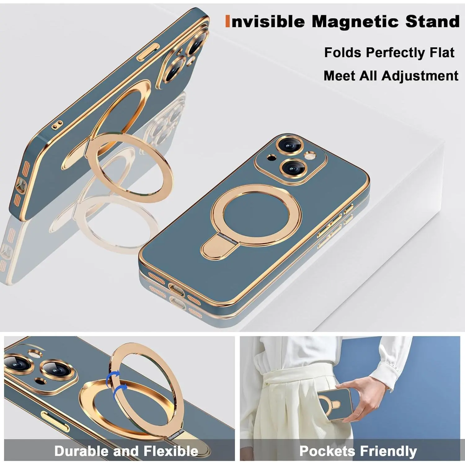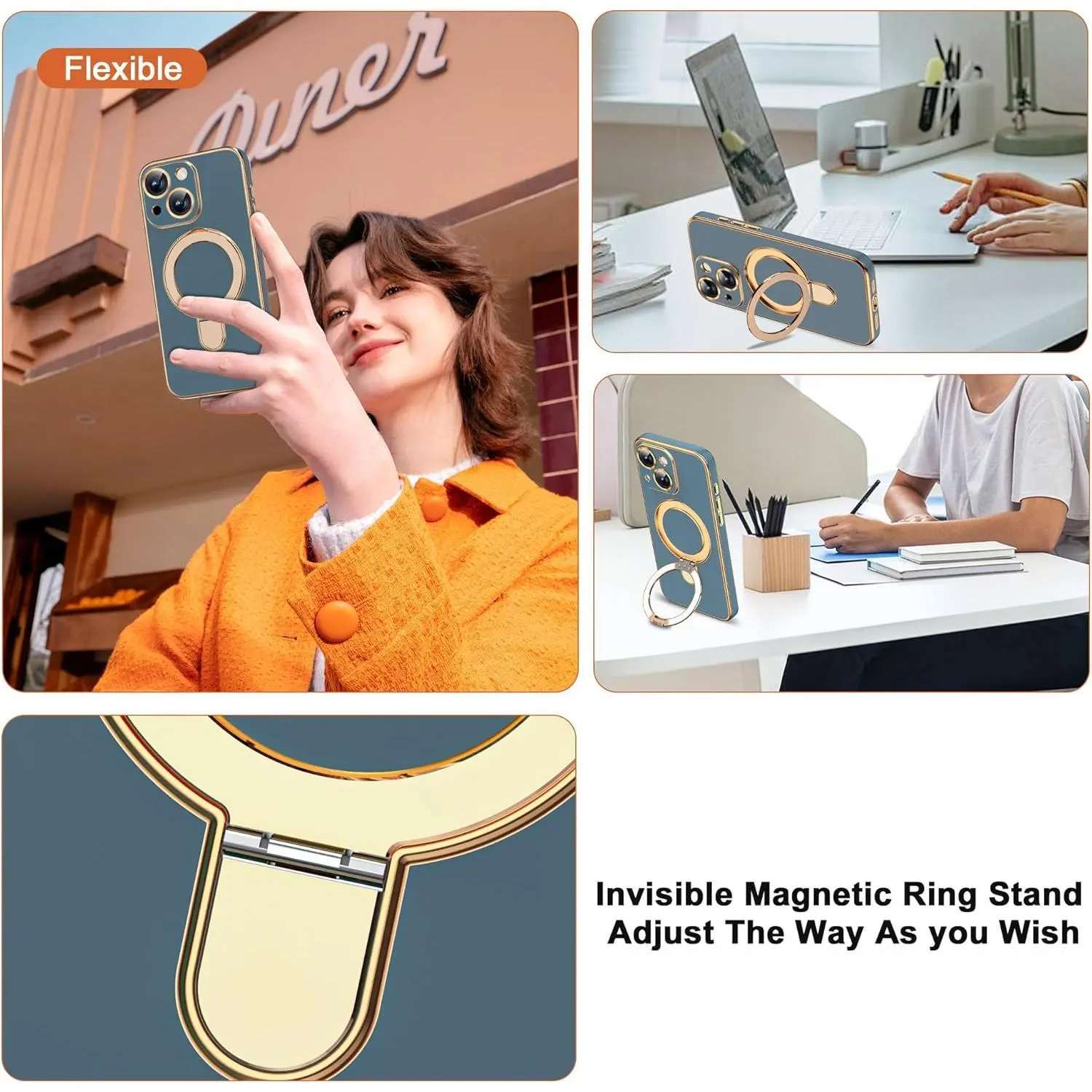 Compatible with iPhone 14 Case with Magnetic Ring Stand [Compatible with Mag-Safe] [Full Camera Lens Protector] Soft Plating Phone Case for iPhone 14 6.1", Grey Blue