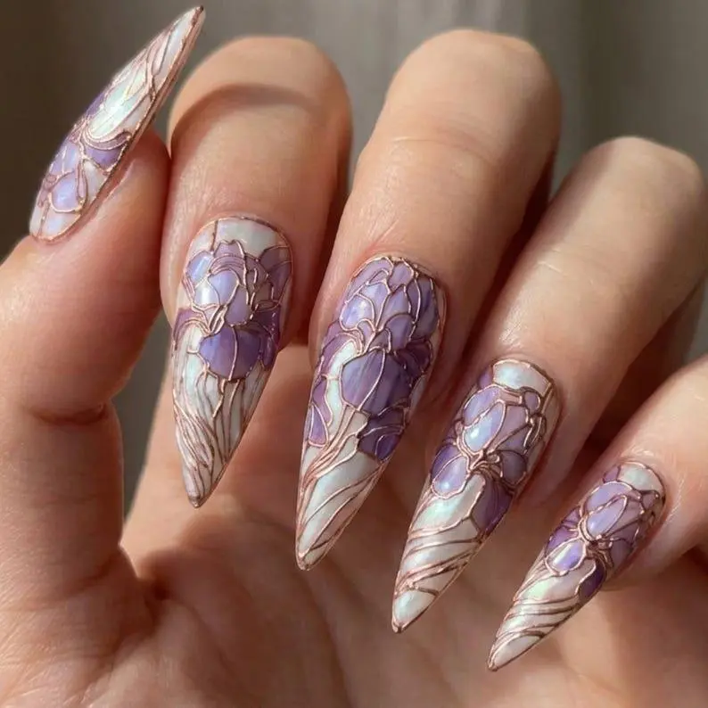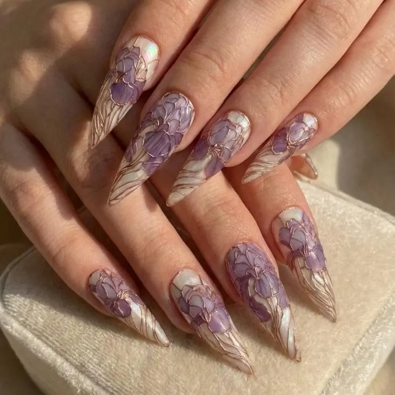 4. Purple Iris Stained Glass Press On Nails | Ethereal Art Nouveau Botanical Nail Art