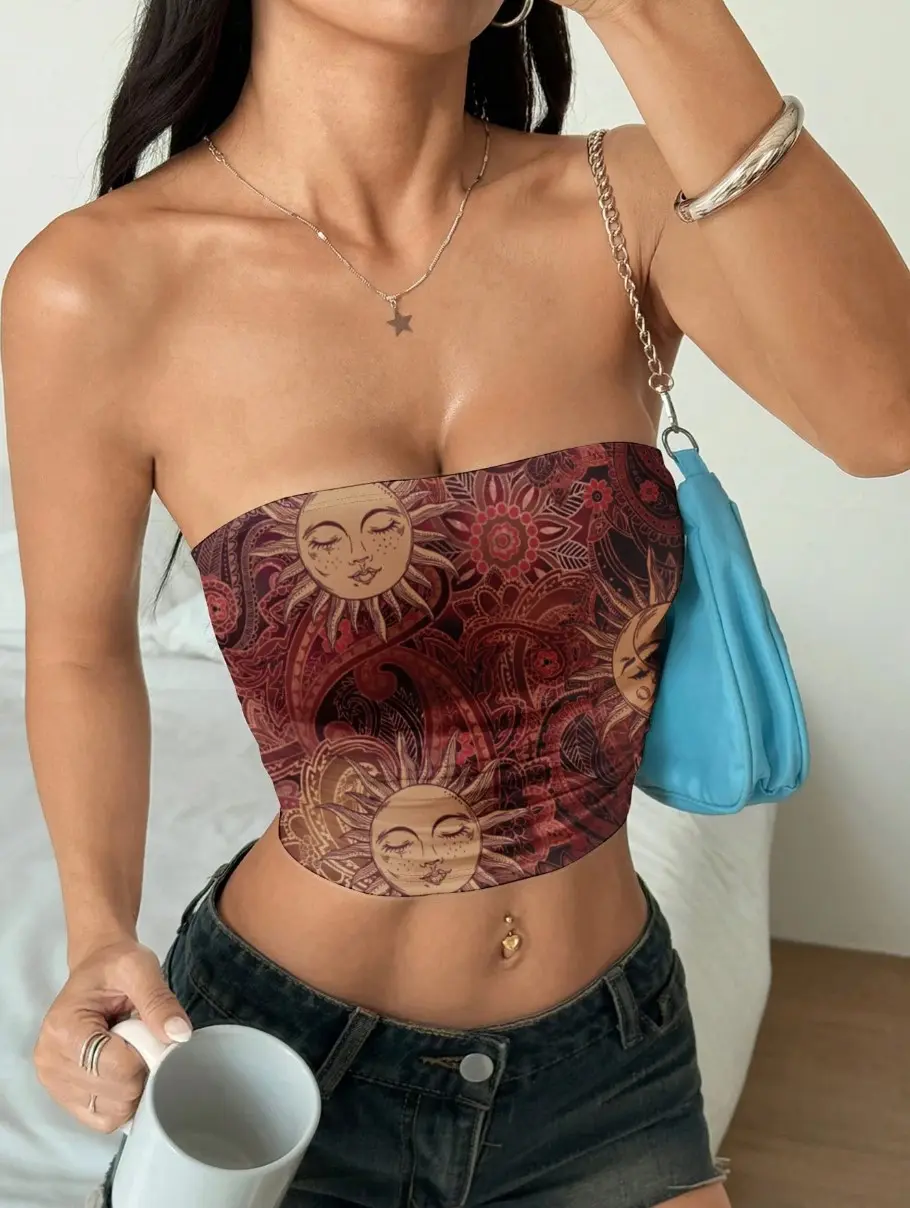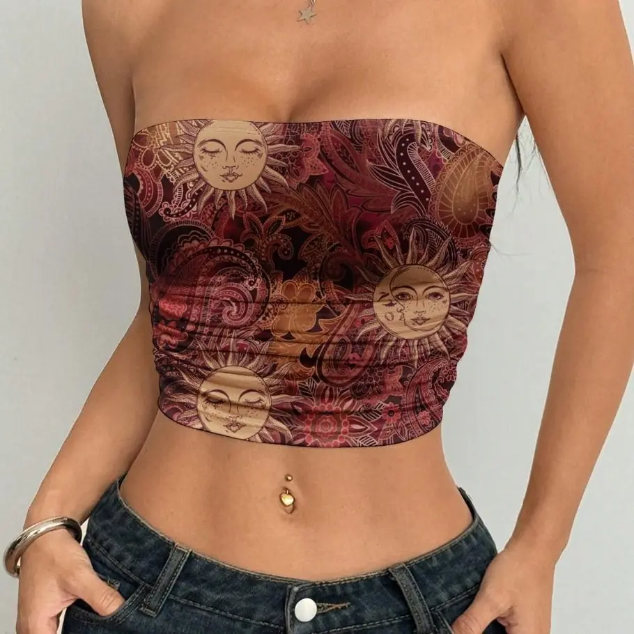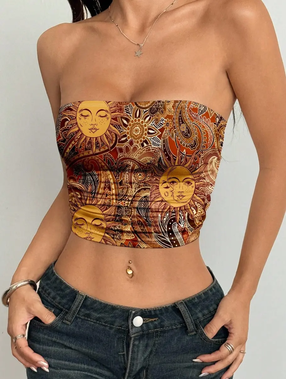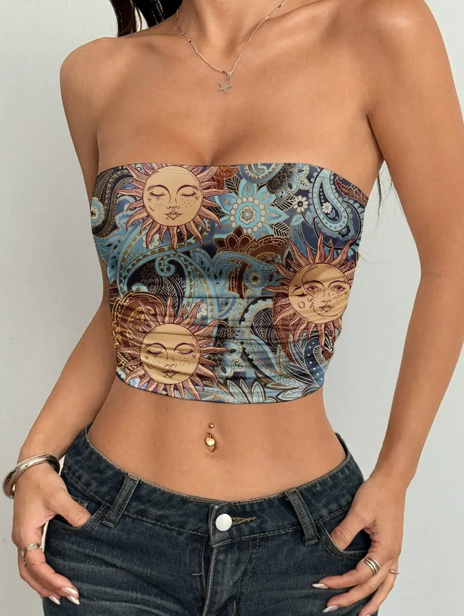 Casual Minimalist Ruched Bodice Grunge Style Cashew Flower & Paisley Retro Print Bandeau Top, Versatile For Summer, Vacation, Music Festival