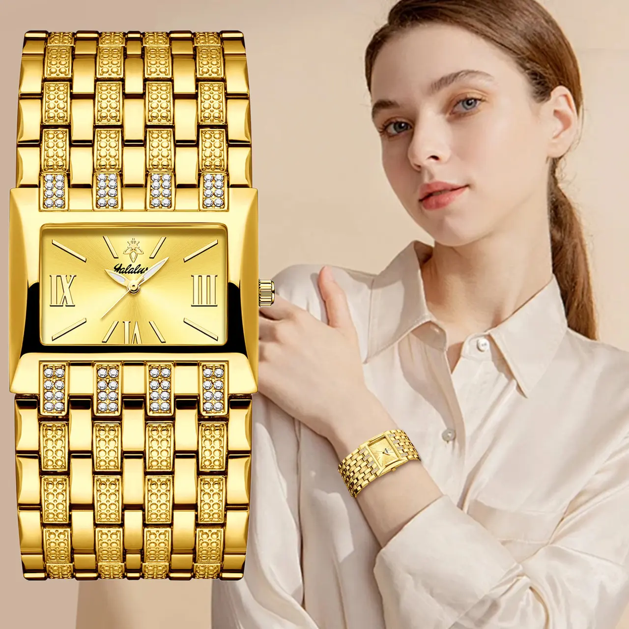 Women's Luxury Gold Square Diamond Watch - Elegant Bling Crystal Encrusted Bracelet with Roman Numerals, Stainless Steel Band, Fashion Dress Wristwatch, Perfect Gift for Her