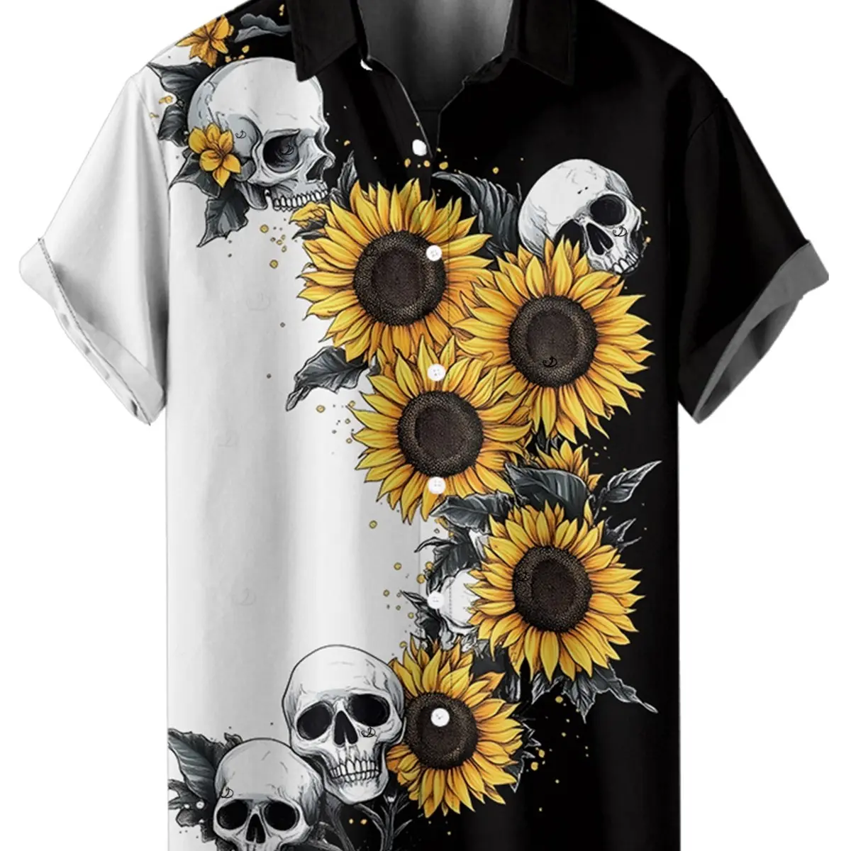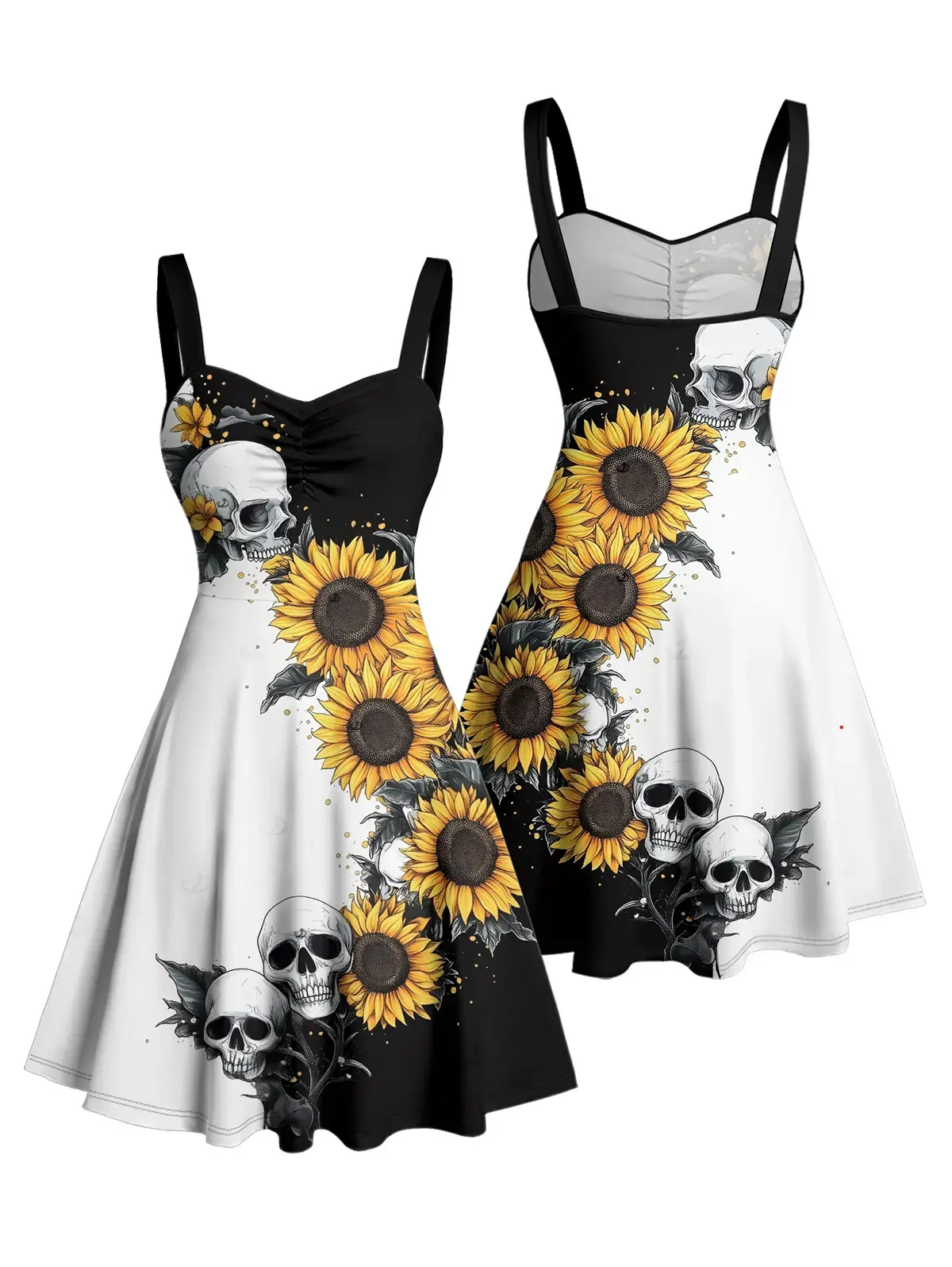 2026 Women's Gothic Dresses Contrast Color Sunflower Skulls Pattern Ruched Bust Dress Sweetheart Neck A Line Mini Holiday Dress