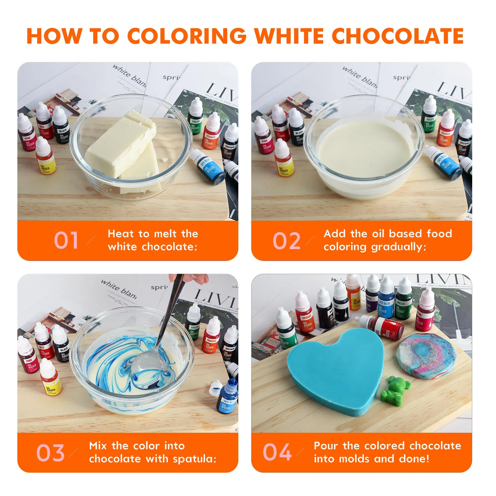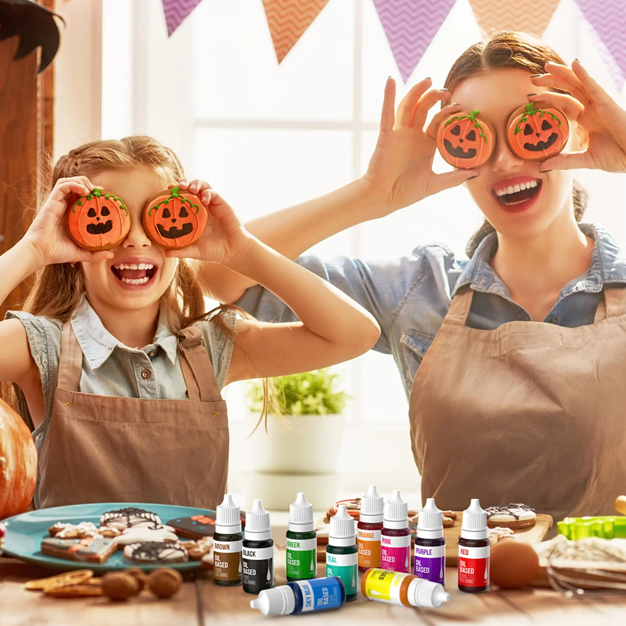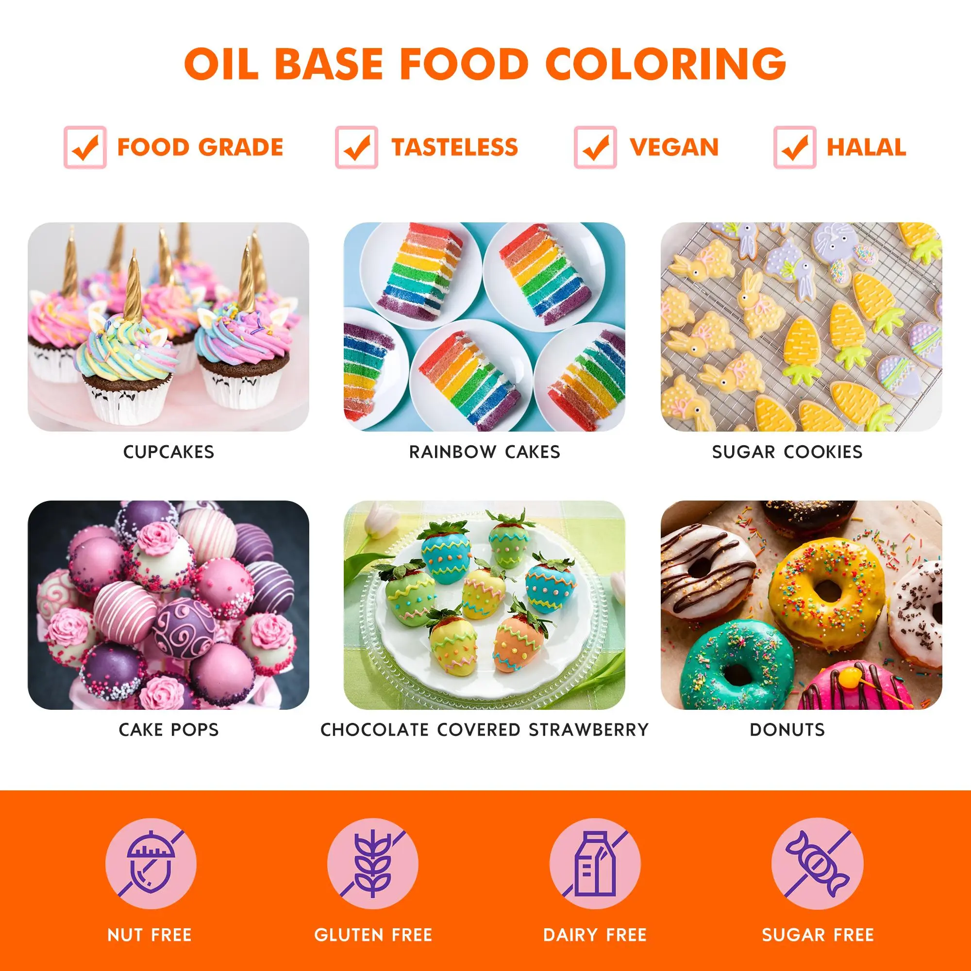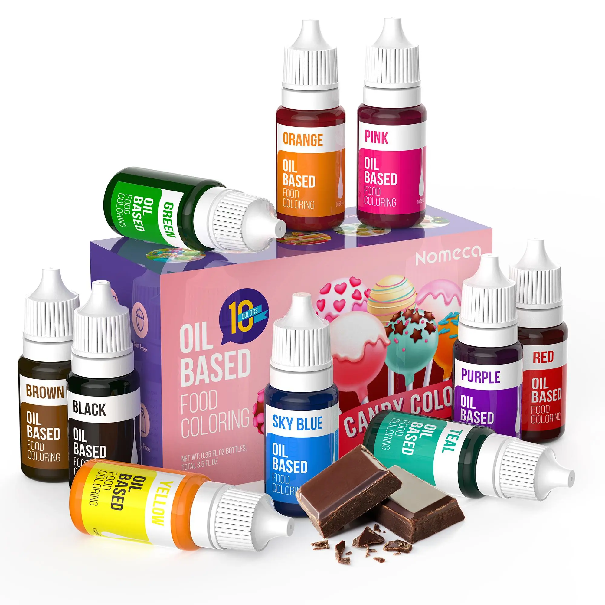 This oil-based candy coloring set includes 10 vibrant shades — Red, Black, Yellow, Green, Sky Blue, Orange, Purple, Brown, Pink, and Teal.