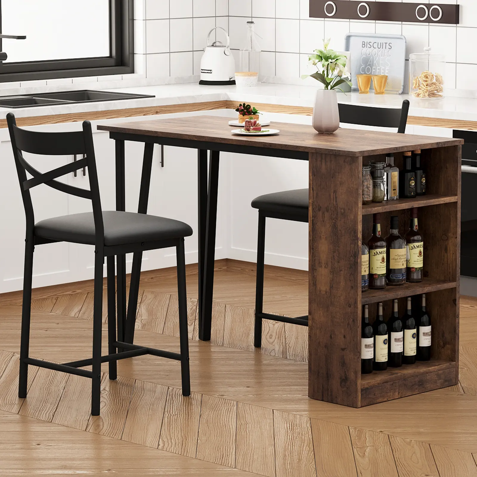 ·Multi-Functional Design: The set features a rectangular table with a convenient drop leaf extension, adapting easily from close meals for two to accommodating extra guests. Three built-in storage shelves beneath the tabletop offer easy access to tableware, glasses, or cookbooks, maximizing every square inch of your home.