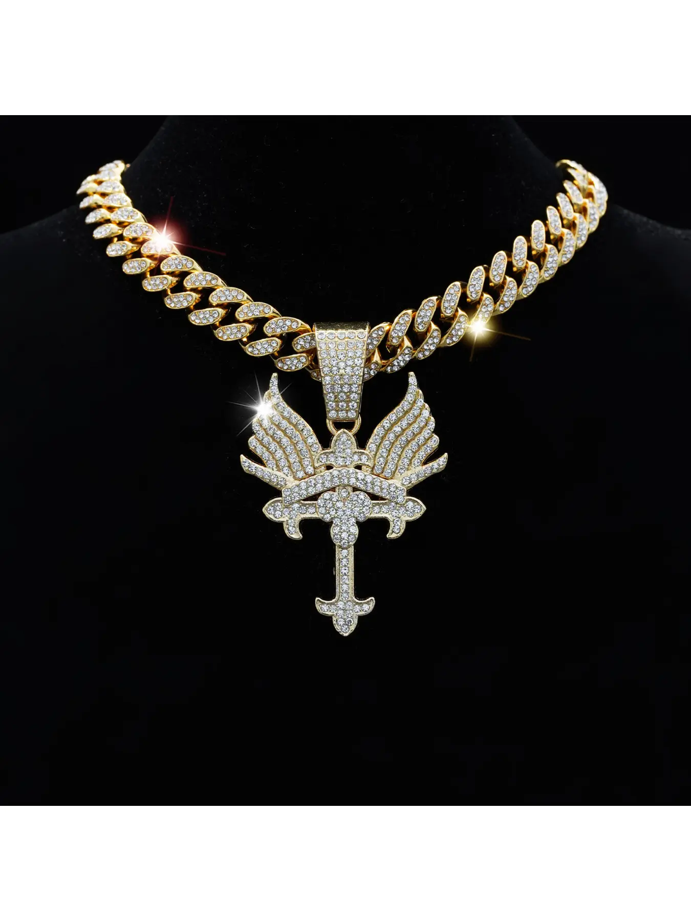 Full-diamond winged pendant, fashionable and creative alloy Cuban chain, personalized trendy necklace accessory