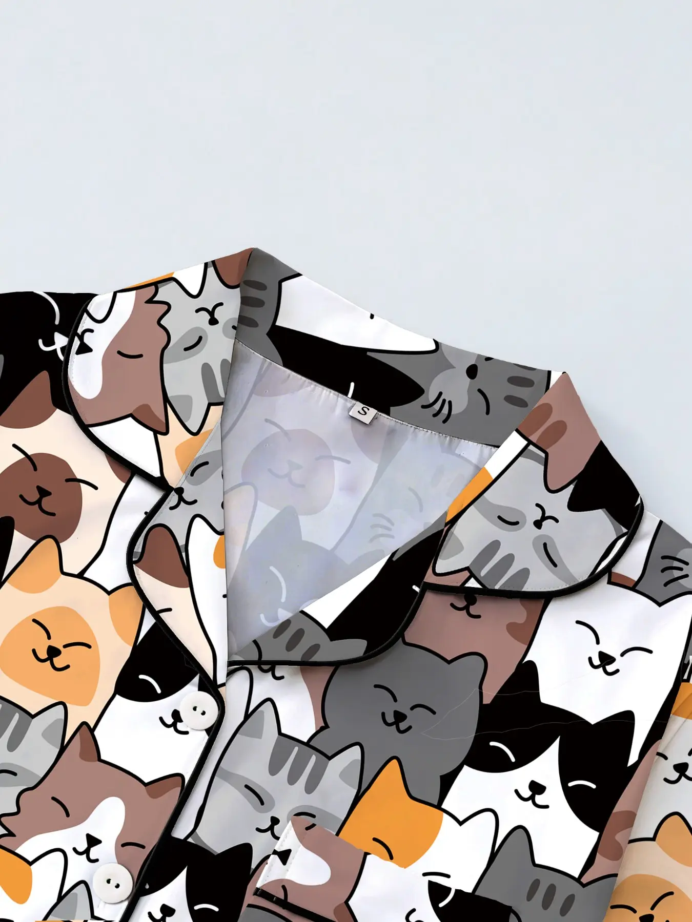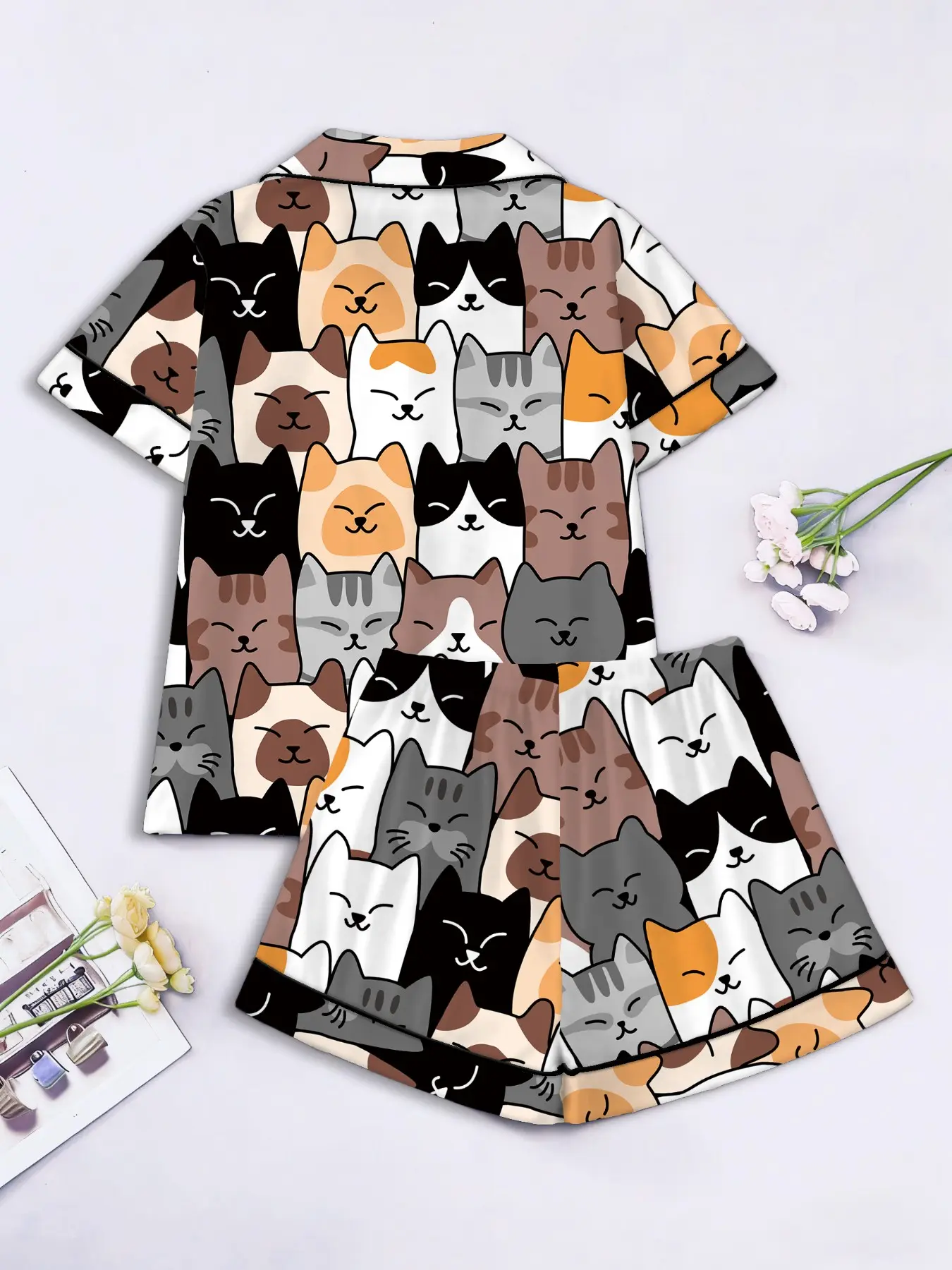 Women's Short Sleeve Button Down Top and Shorts Pajama Set, Spring Summer Wear, For Japanese Kawaii Soft Girls, White Base Soft Cat Head Print, Small Lapel Collar, Slim Fit No Bulk, Comfortable For Daily Home Wear