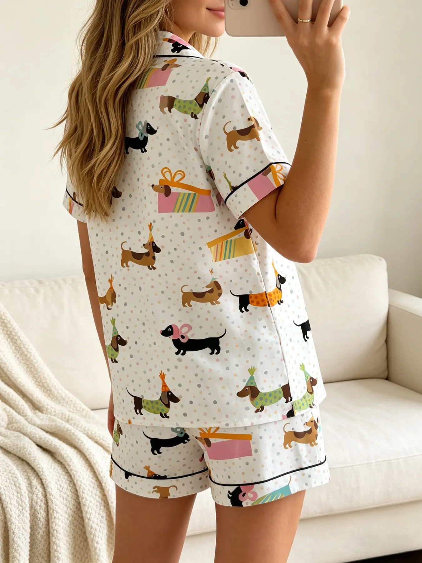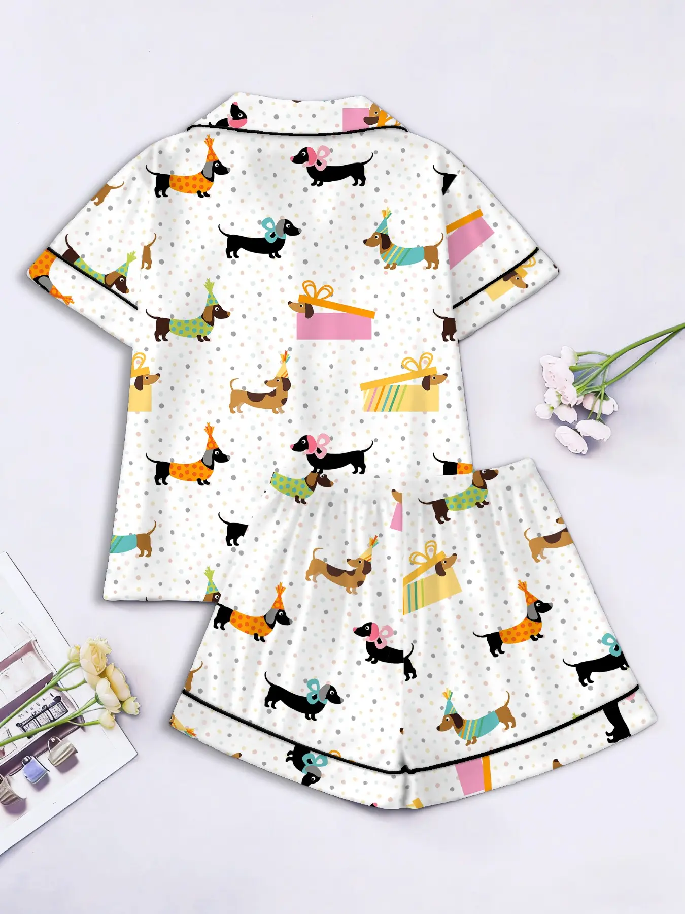 Women's Short Sleeve Button Down Top and Shorts Pajama Set, Spring Summer Wear, For Cute Girls, White Base Adorable Party Dog Print, Classic Lapel Collar, Loose Fit, Comfortable For Home & Gatherings