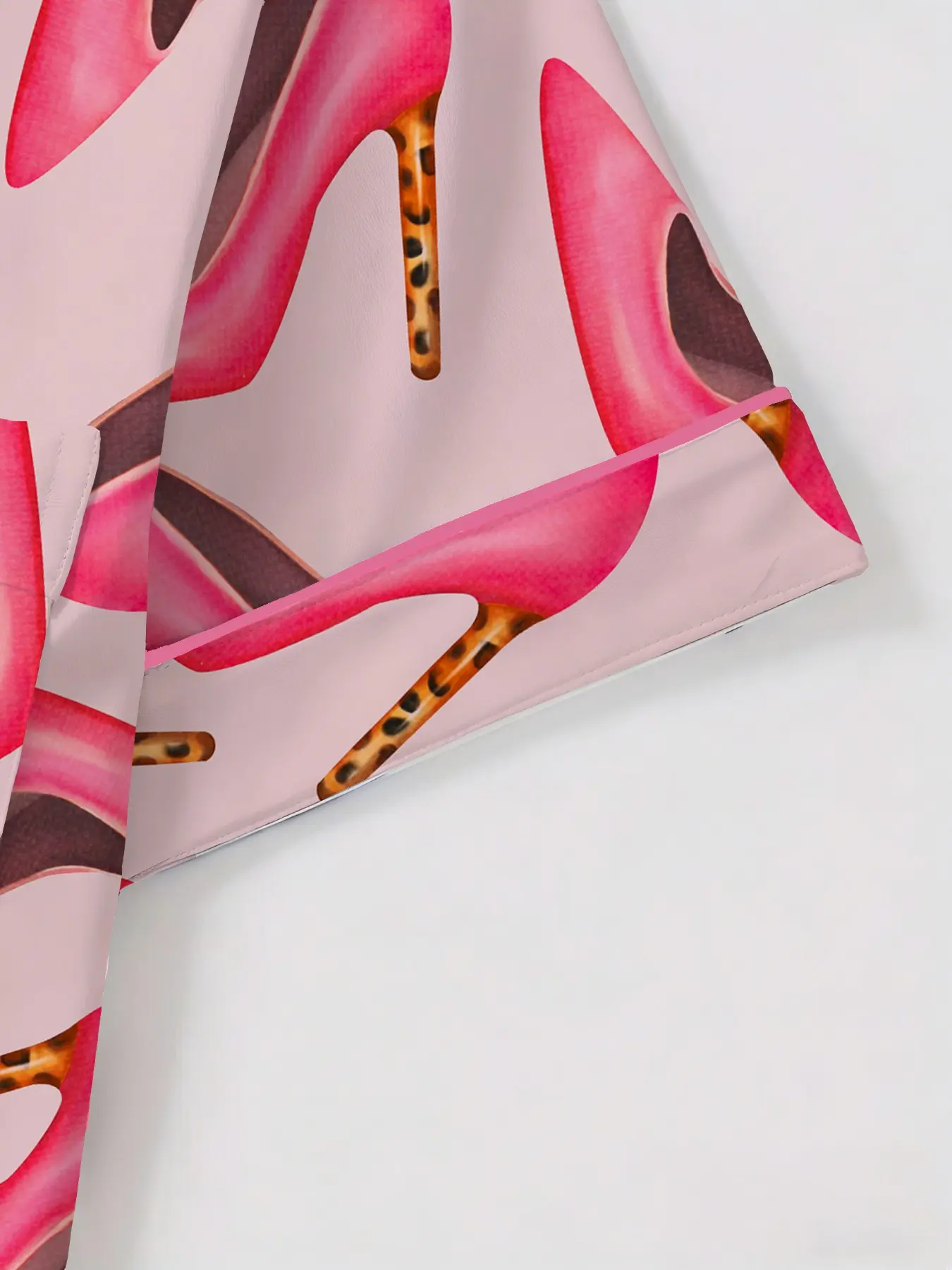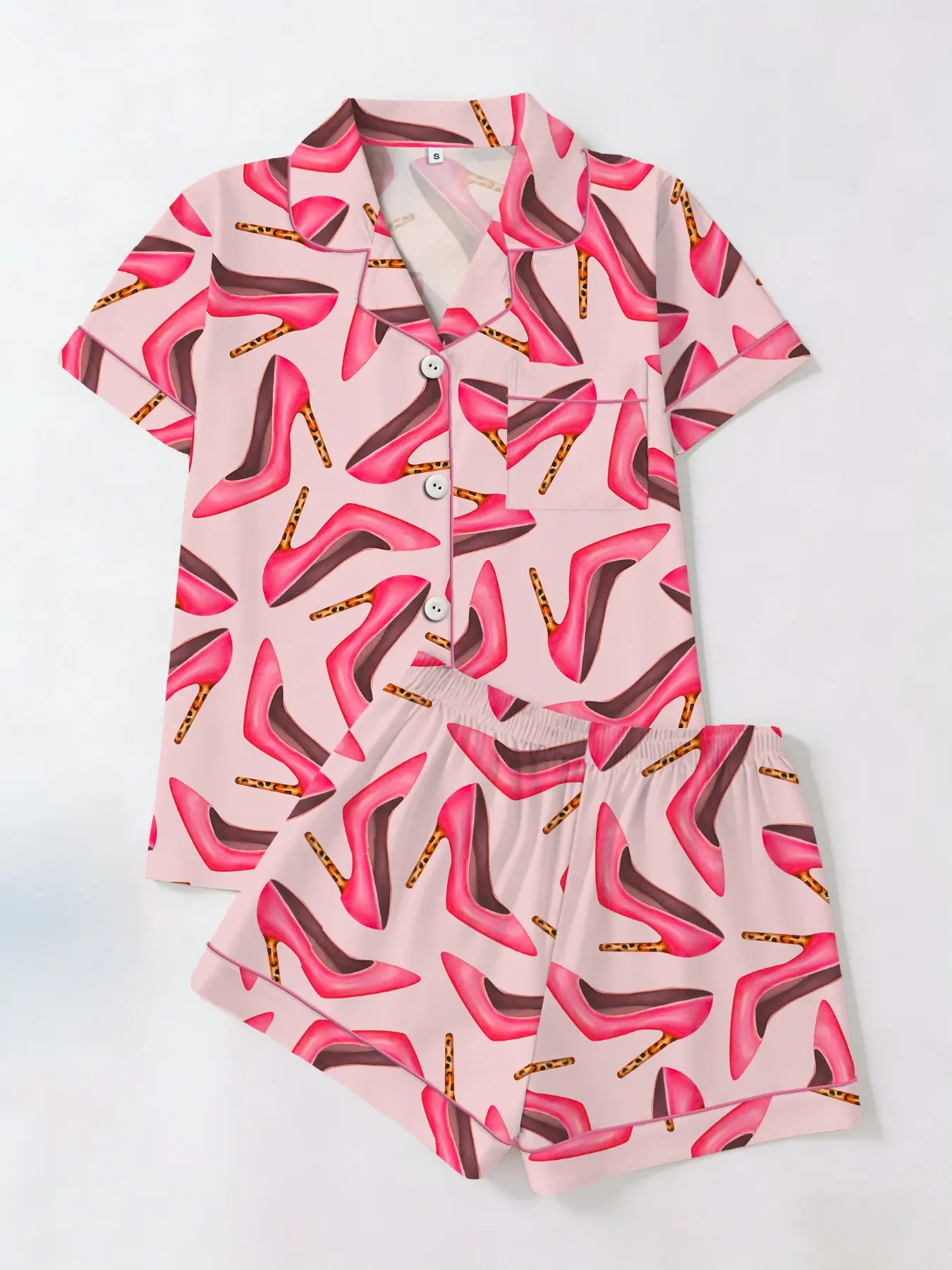 Women's Short Sleeve Button Down Top and Shorts Pajama Set, Spring Summer Wear, For Elegant Mature Ladies, Pink Muted High Heel Print, Classic Lapel Collar, Loose Draping Fit, Comfortable For Home & Office