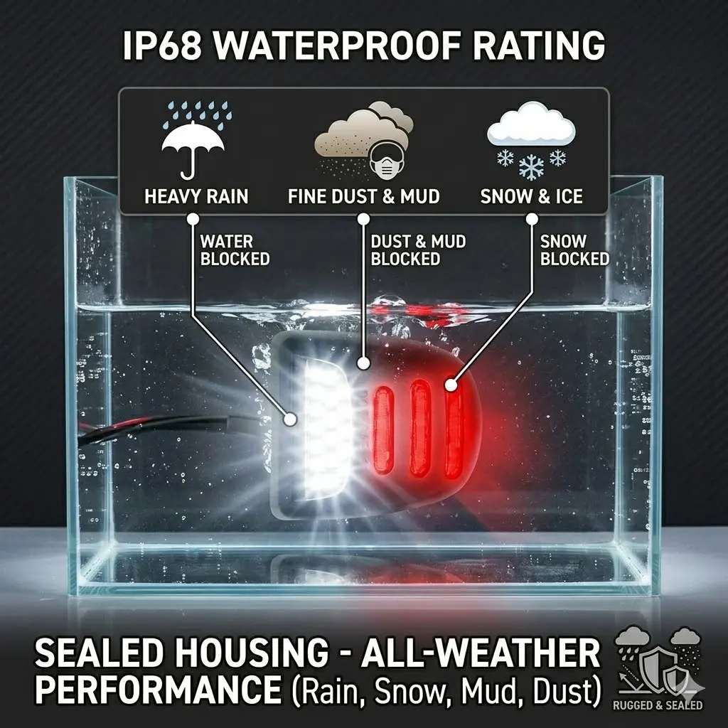 ·IP68 WEATHERPROOF DURABILITY: Upgraded polycarbonate (PC) housing offers superior impact resistance and a fully sealed IP68 waterproof rating to perform reliably in rain, snow, or dusty off-road environments.