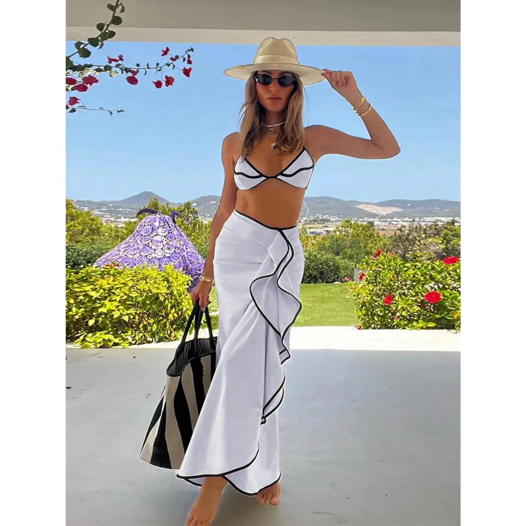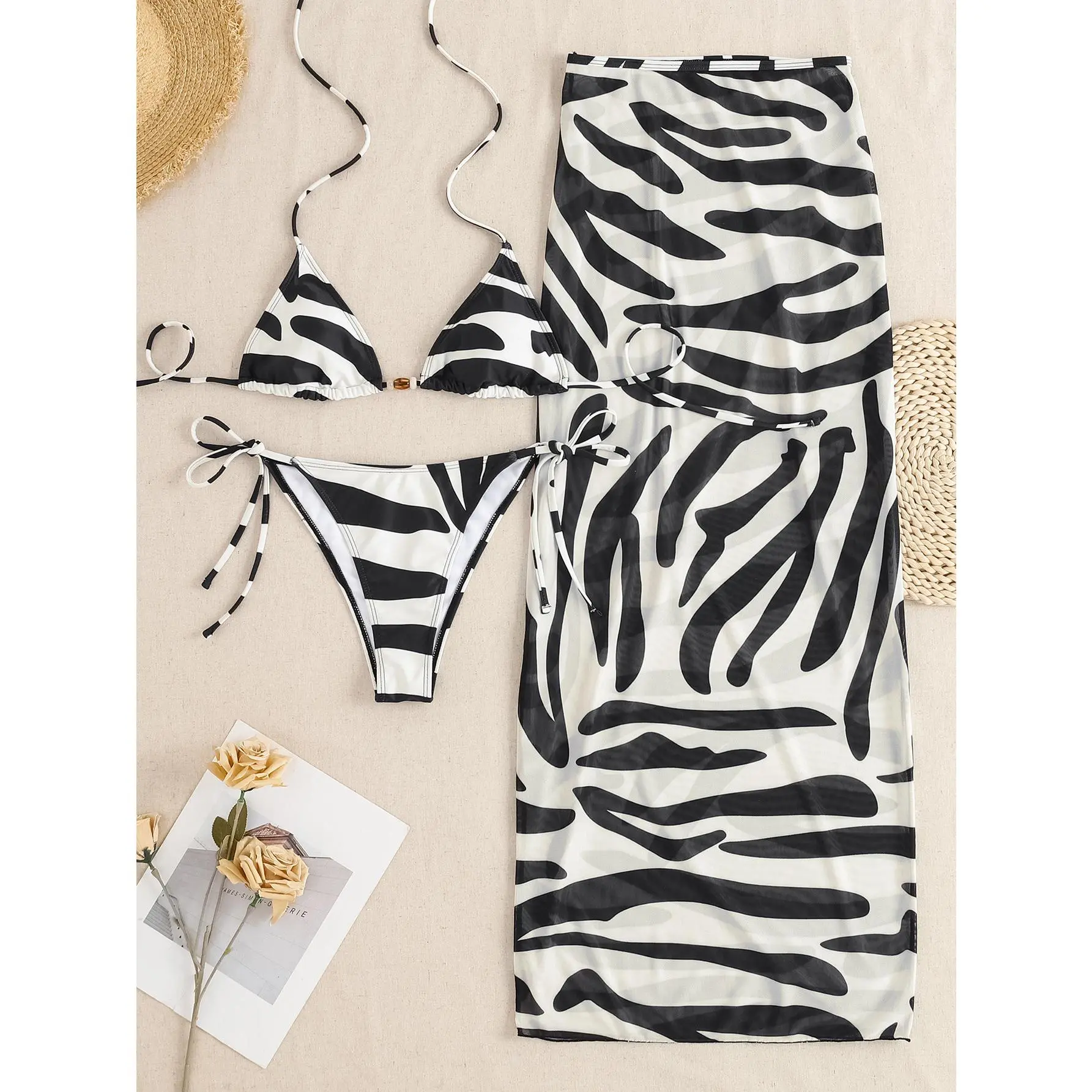 Women's Blue Paisley 3-Piece Swimsuit Set with Cover Up - Halter Bikini & Maxi Beach Cover Up for Summer Vacation,#ResortWear & Poolside Outfits,Floral triangle cup camisole dress, bikini three-piece swimsuit