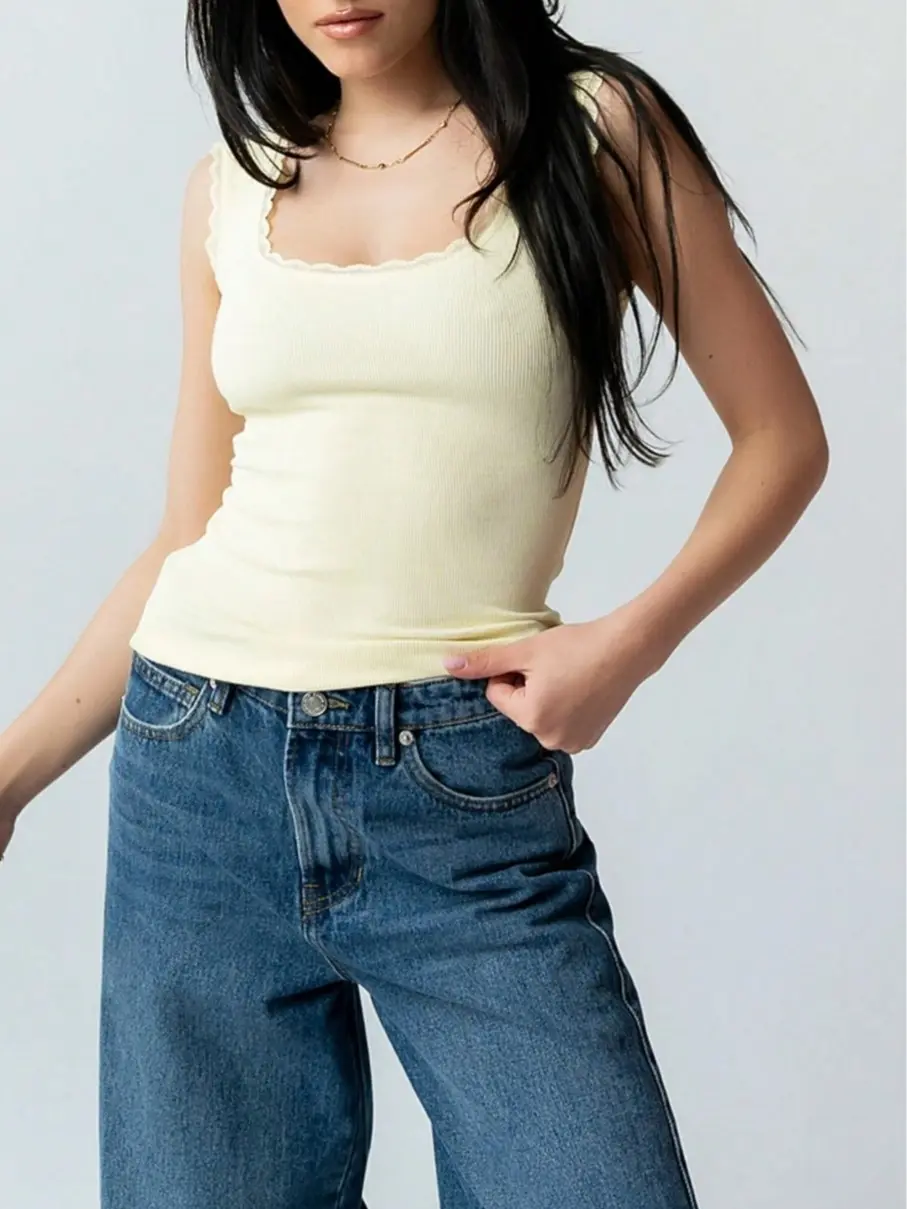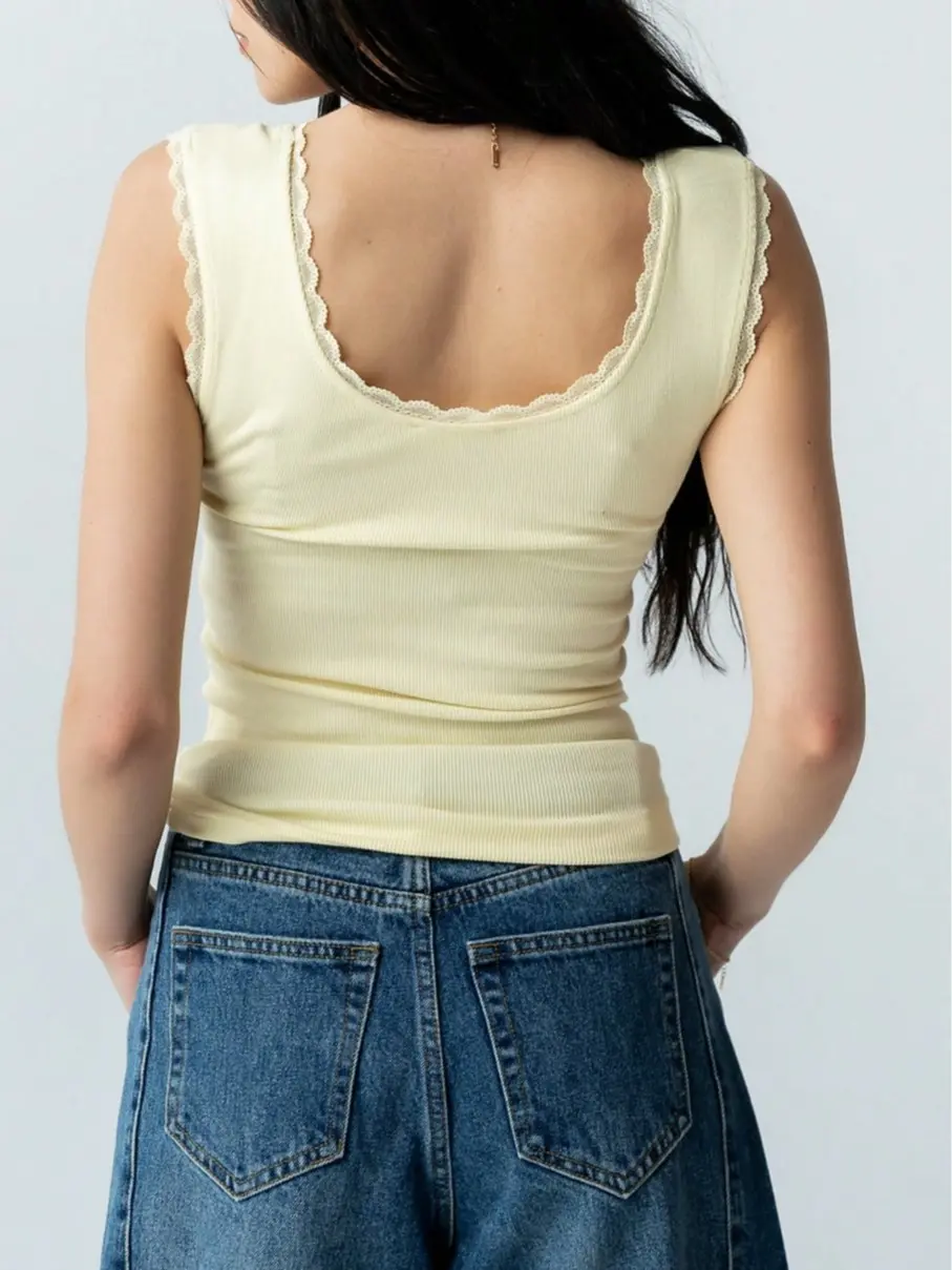 Women Square Neck Lace Trim Tank Top Y2k Ribbed Knit Slim Fit Camisole Crop Top Sexy Fitted Sleeveless T-Shirts Going Out Streetwear Basic Minimalist