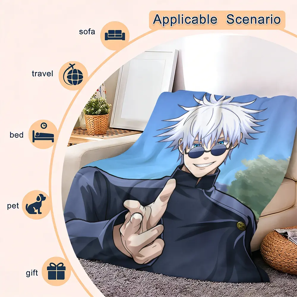 This Gojo Satoru Blanket Cover is ideal for Jujutsu Kaisen enthusiasts. It's a plush throw blanket that adds a cozy touch to any space. Perfect for beds, sofas, and offices, it's a versatile decoration. Ideal for travel too, it's soft and warm, suitable for all four seasons. A great gift for fans, friends, and children.