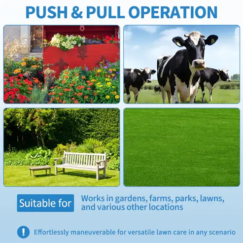 Easy Assembly & Effortless Use: Tool-free quick assembly with an ergonomic U-shaped handle, designed for both push and tow-behind use, making lawn care easier while allowing convenient transport and space-saving storage.