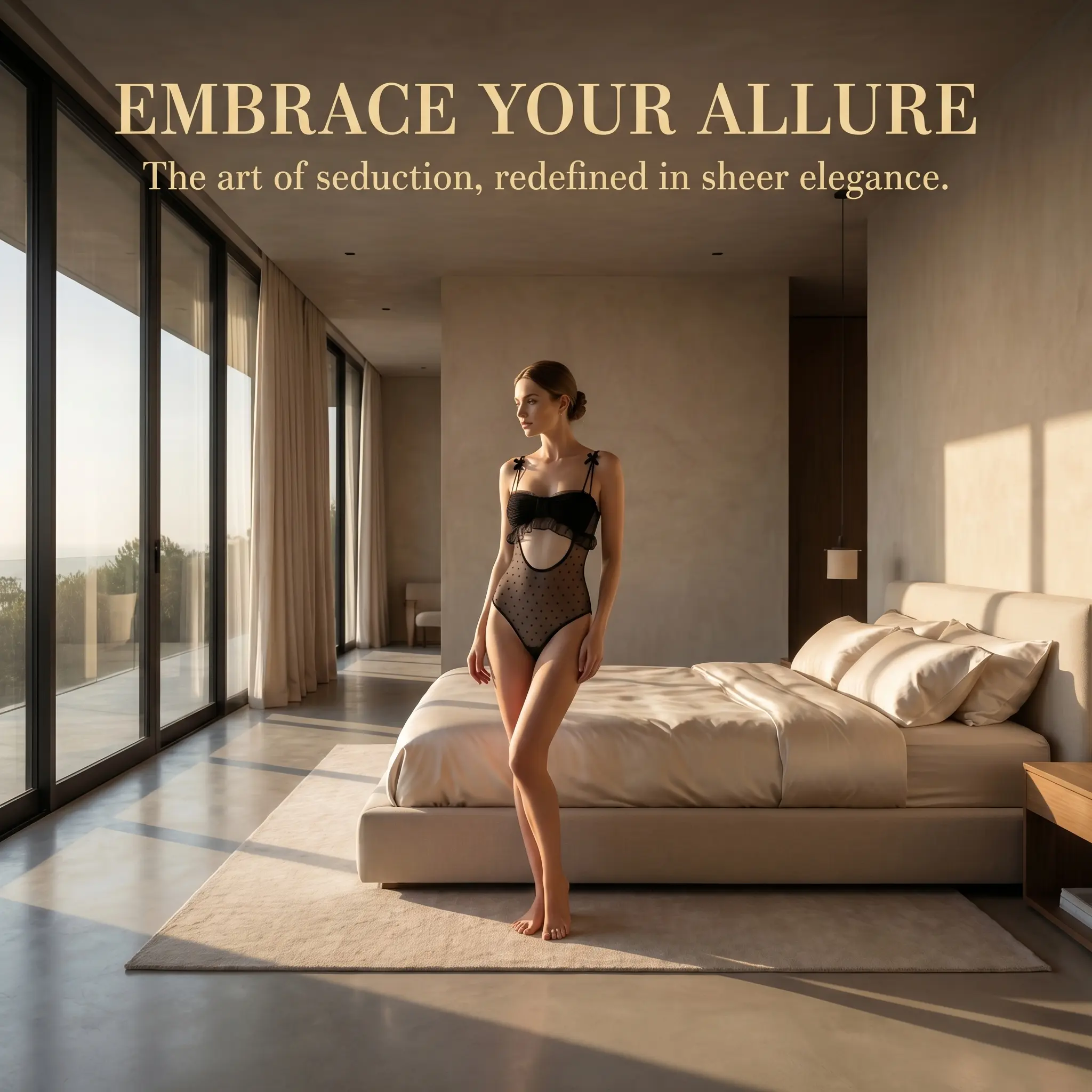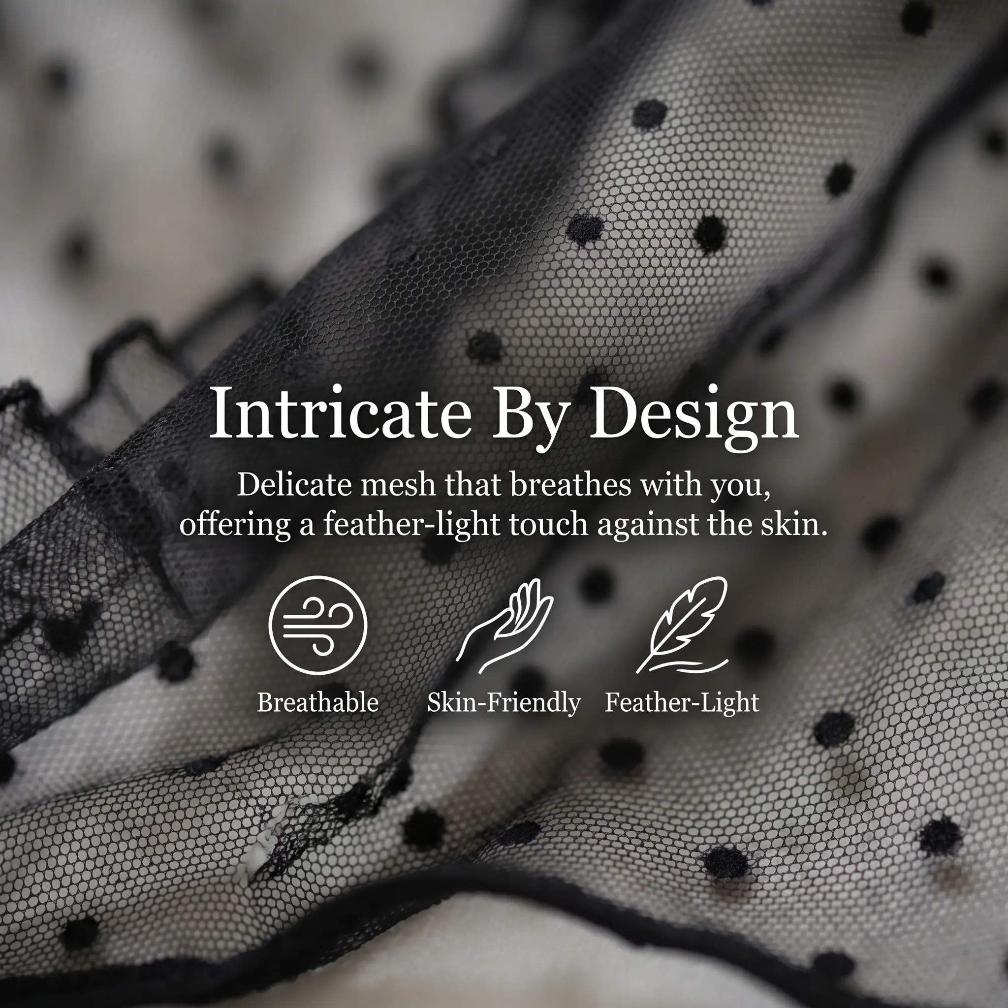 Chic Coquette Aesthetic: Features a playful Polka Dot Mesh paired with elegant Ruffle Trims and dainty Bow Straps, blending French vintage charm with modern seduction.