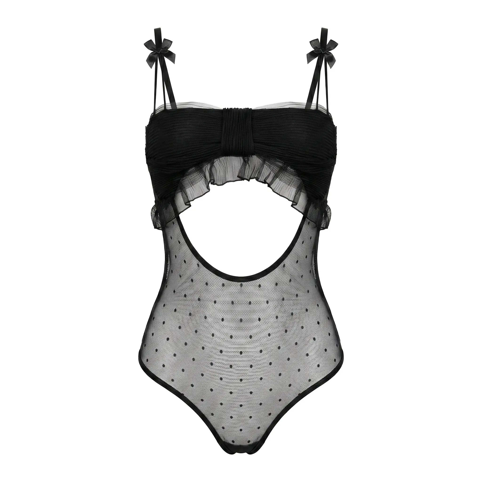 SILIX Chic Black Polka Dot Mesh Teddy Lingerie | Coquette Aesthetic Cut-out Bodysuit with Ruffle Trim & Bow Straps | French Style Sexy One-Piece Exotic Nightwear