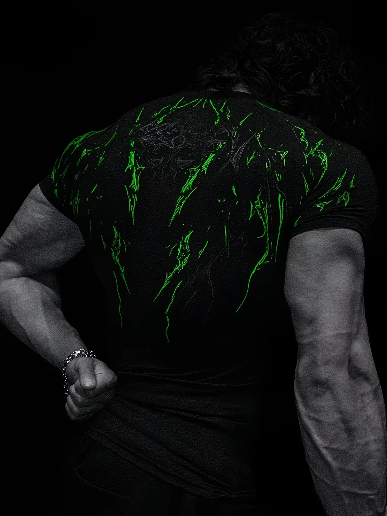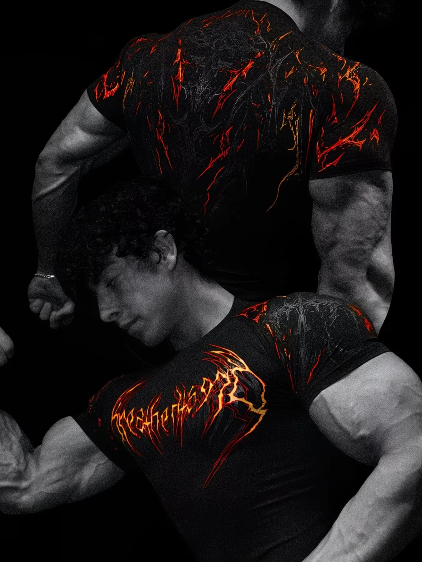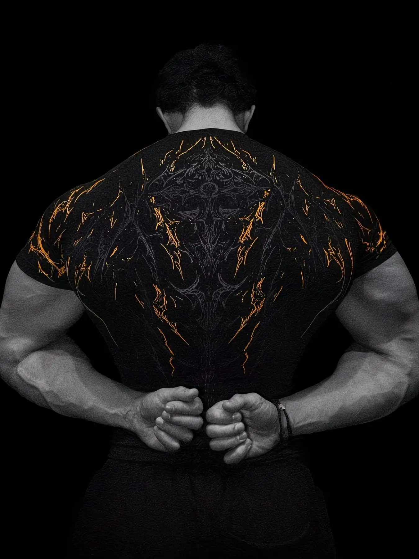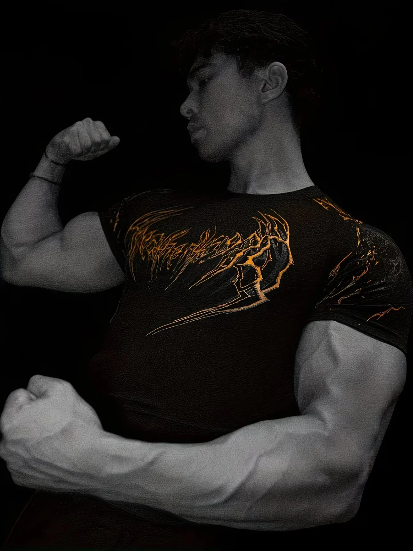 Men's High Elastic Quick-Dry Flame Print Sport T-Shirt, Slim Fit Breathable Short Sleeve, Muscle Training Running Workout Top