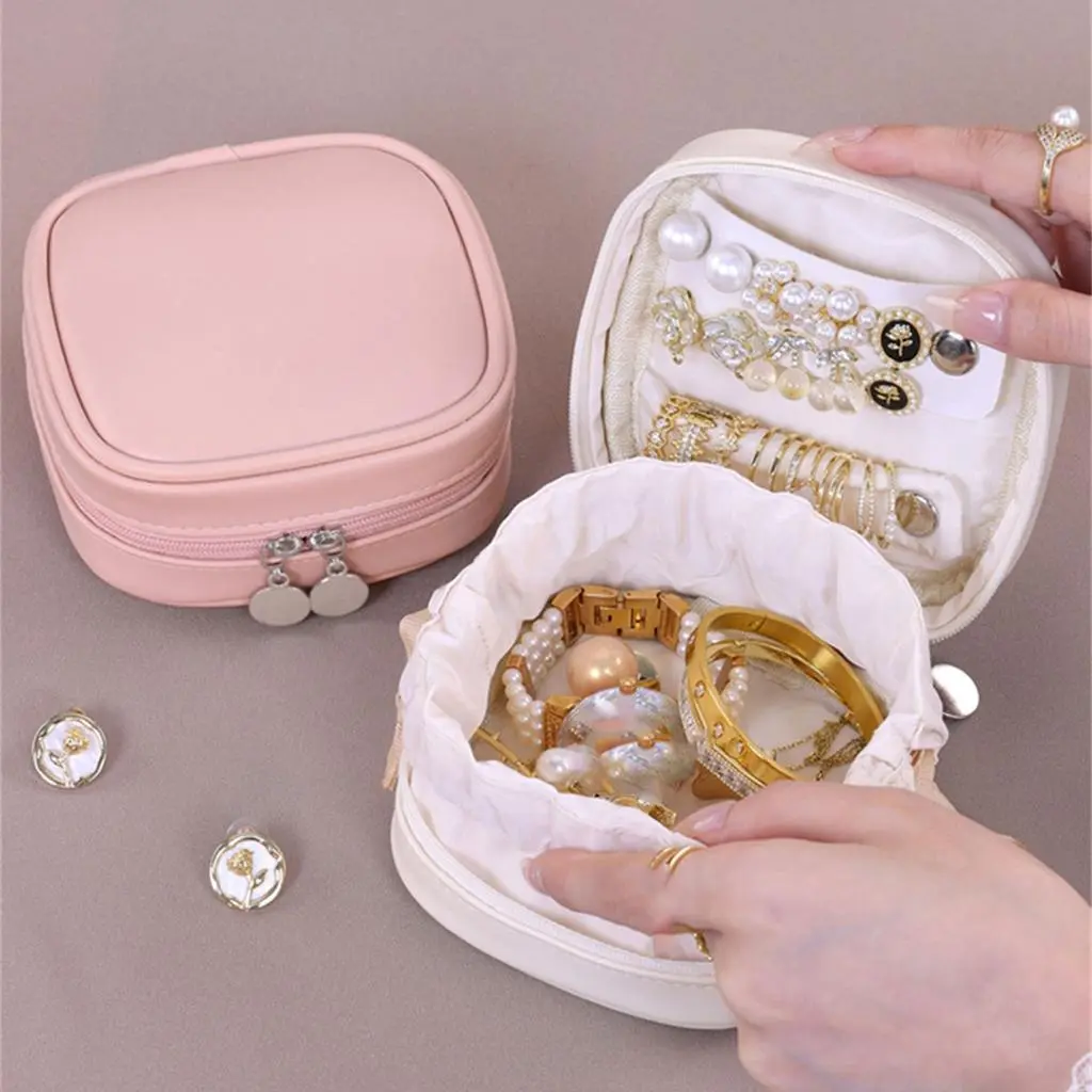 Secure and stylish, this portable jewelry travel organizers features a convenient drawstring closure to keep earrings, rings, necklaces, and bracelets safely stored while maintaining profile during travel or daily use.