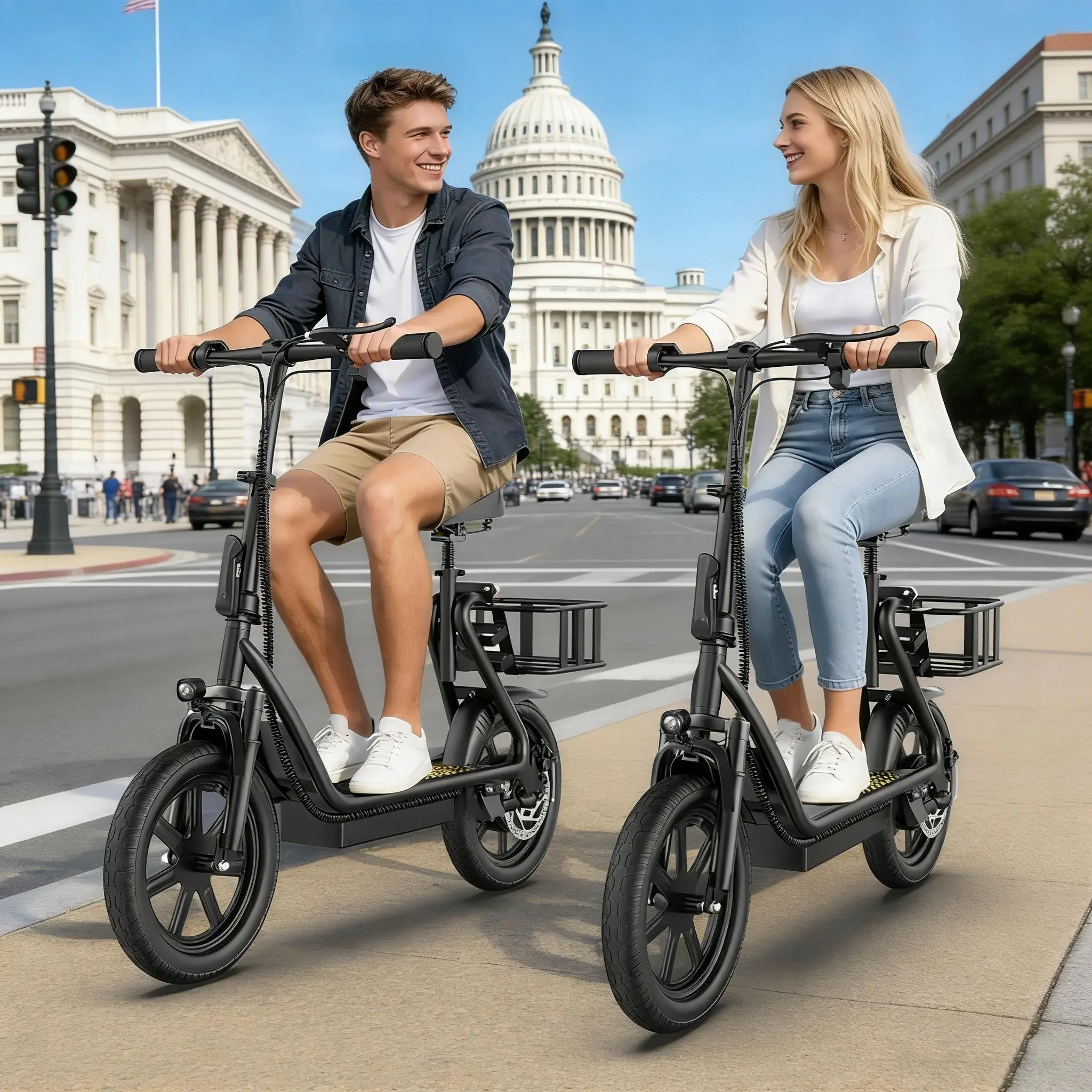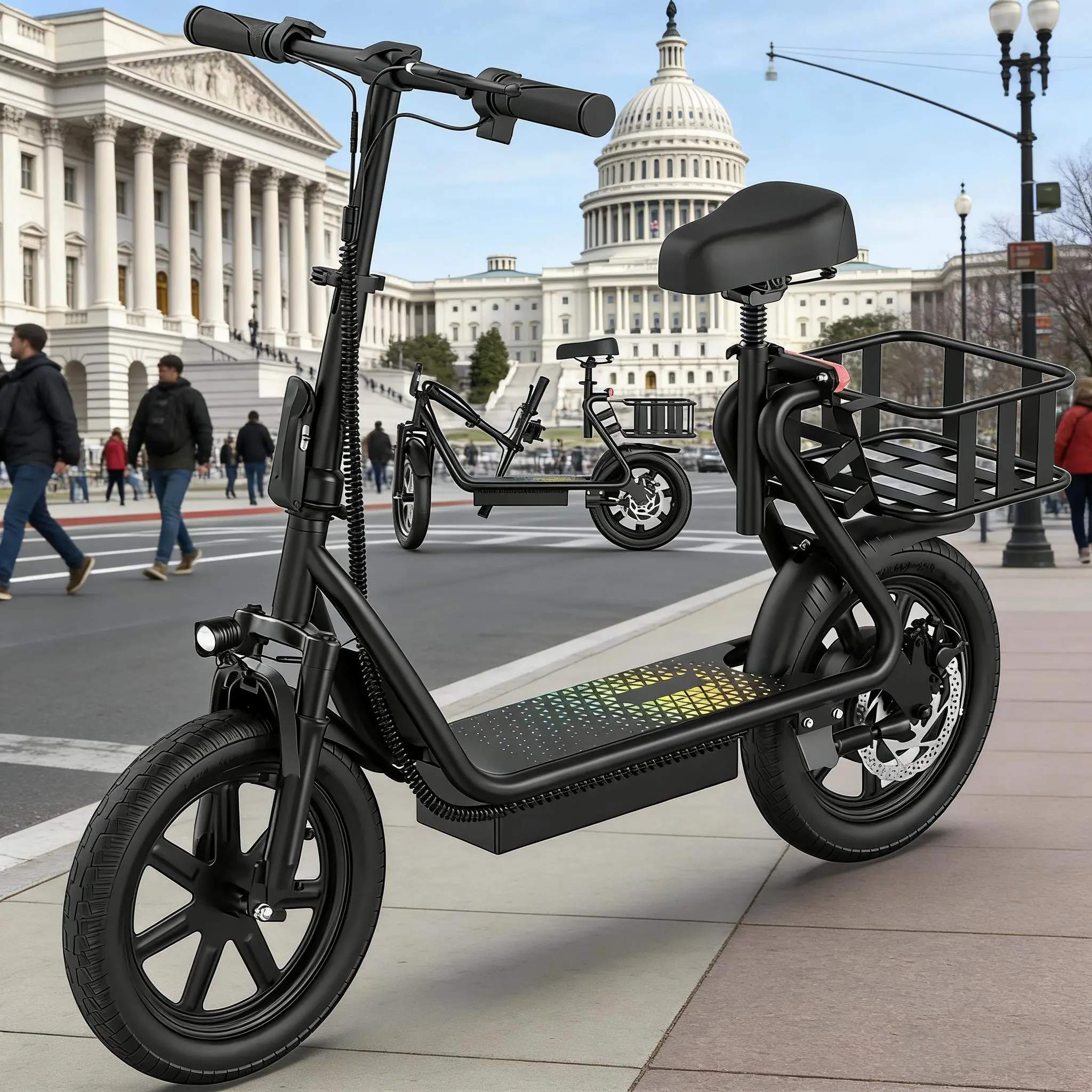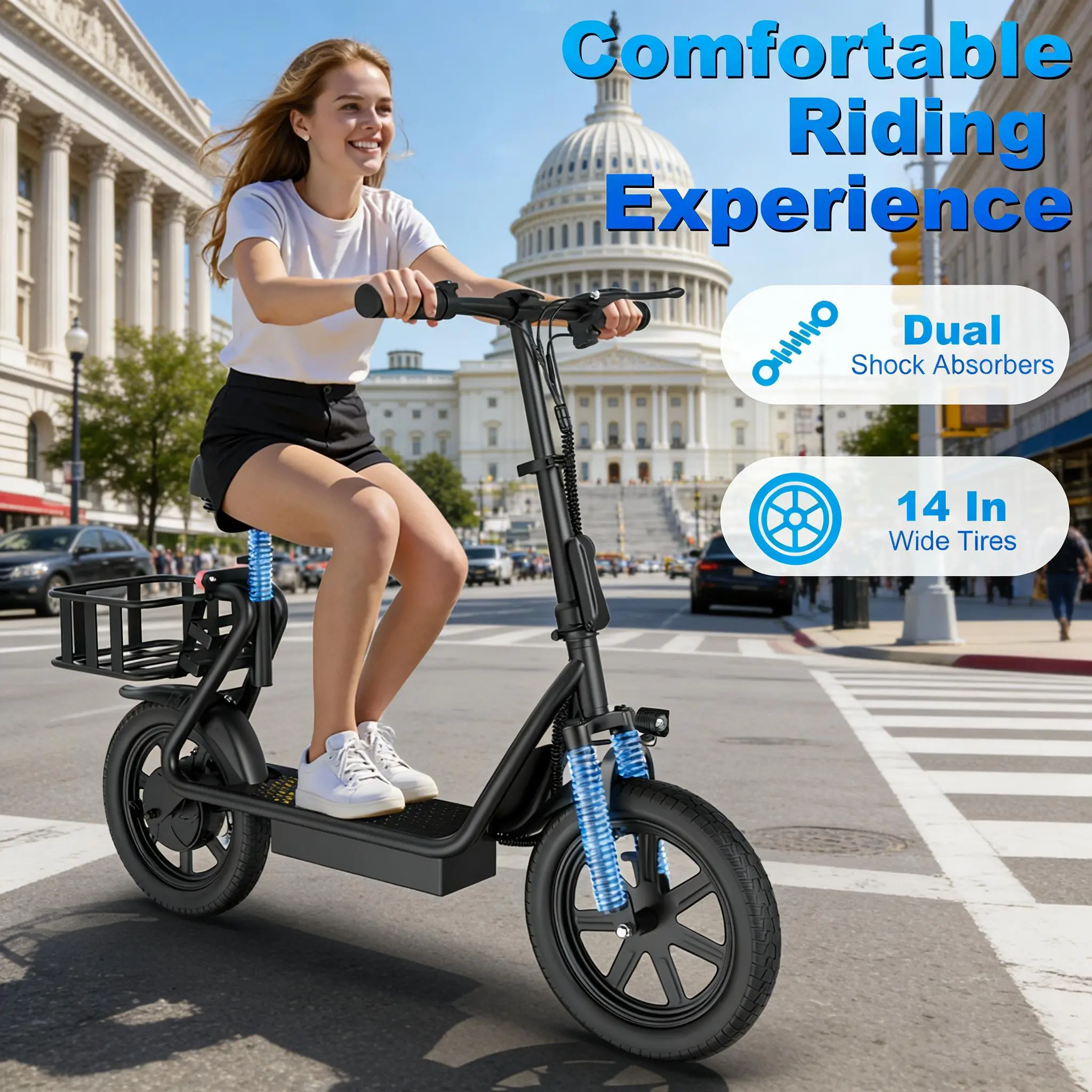 Electric Scooter for Adults with Seat,48V 10.4Ah Battery, Top Speed 22 mph, Driving Range 21-27 Miles, Pet-Friendly Design with Rear Basket