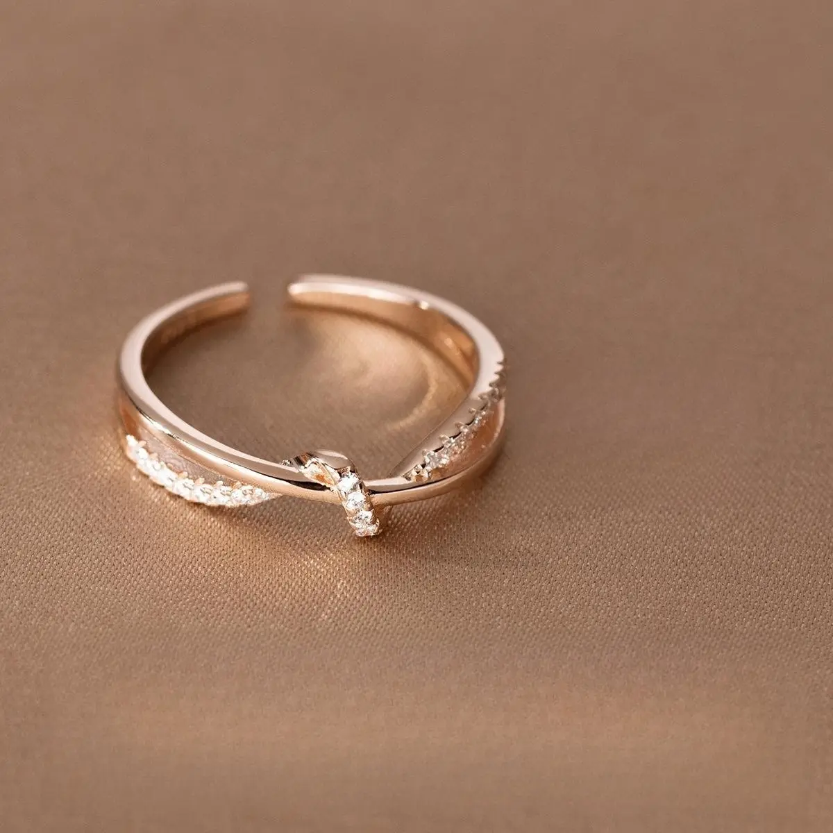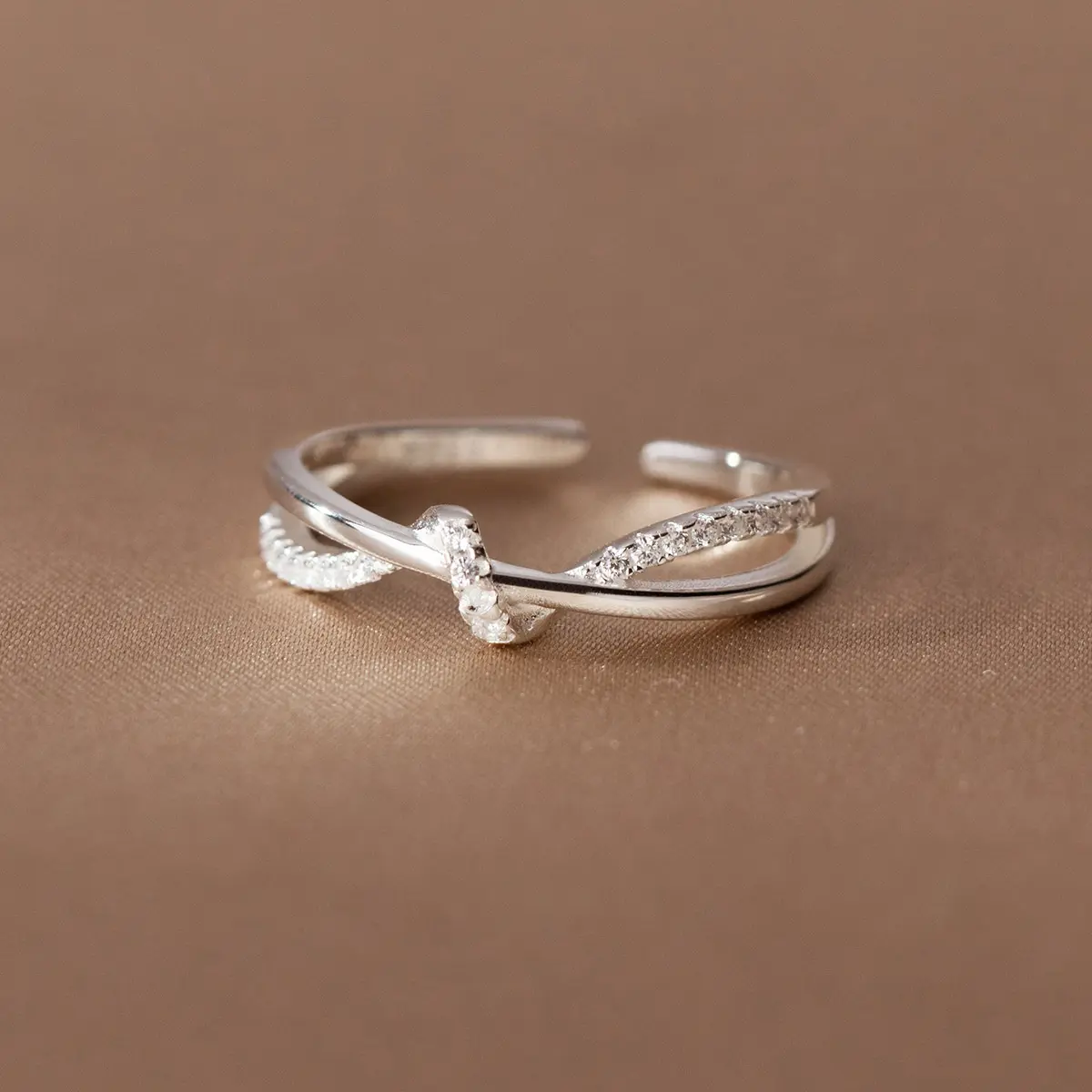 Featuring a refined, crisscross band structure that wraps seamlessly around the finger, this piece is centered around a symbolic knot motif, adorned with a continuous line of meticulously placed, faceted sparkling accents. The open, flowing design creates a visually dynamic look that balances minimalist elegance with romantic charm, while the slim, lightweight profile sits flawlessly against the skin, delivering a luxe, weightless feel that sets it apart from mass-market jewelry.
