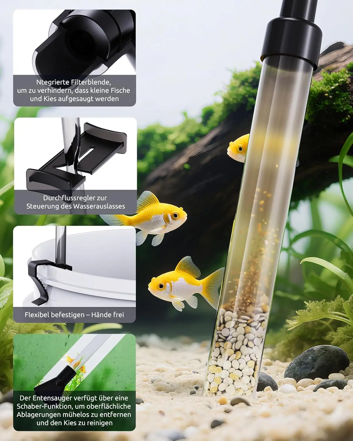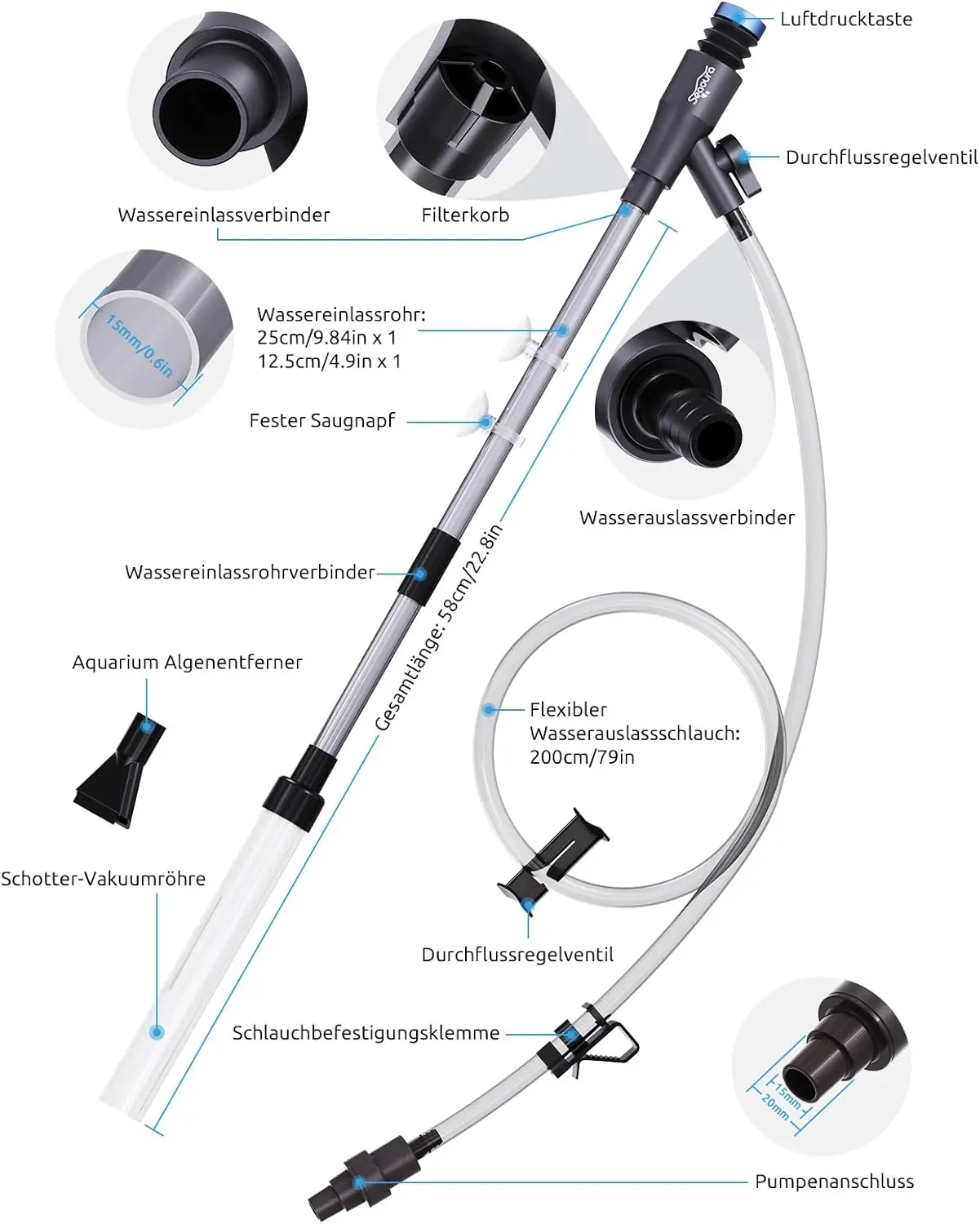 ·4 in 1 Vacuum Cleaner: mini manual aquarium gravel vacuum cleaner offers 4 essential functions: gravel wash, scraping stain, suck manure and adjustable water flow. Using siphon principles, it quickly improves water quality, creating a clean and comfortable tank for your fish