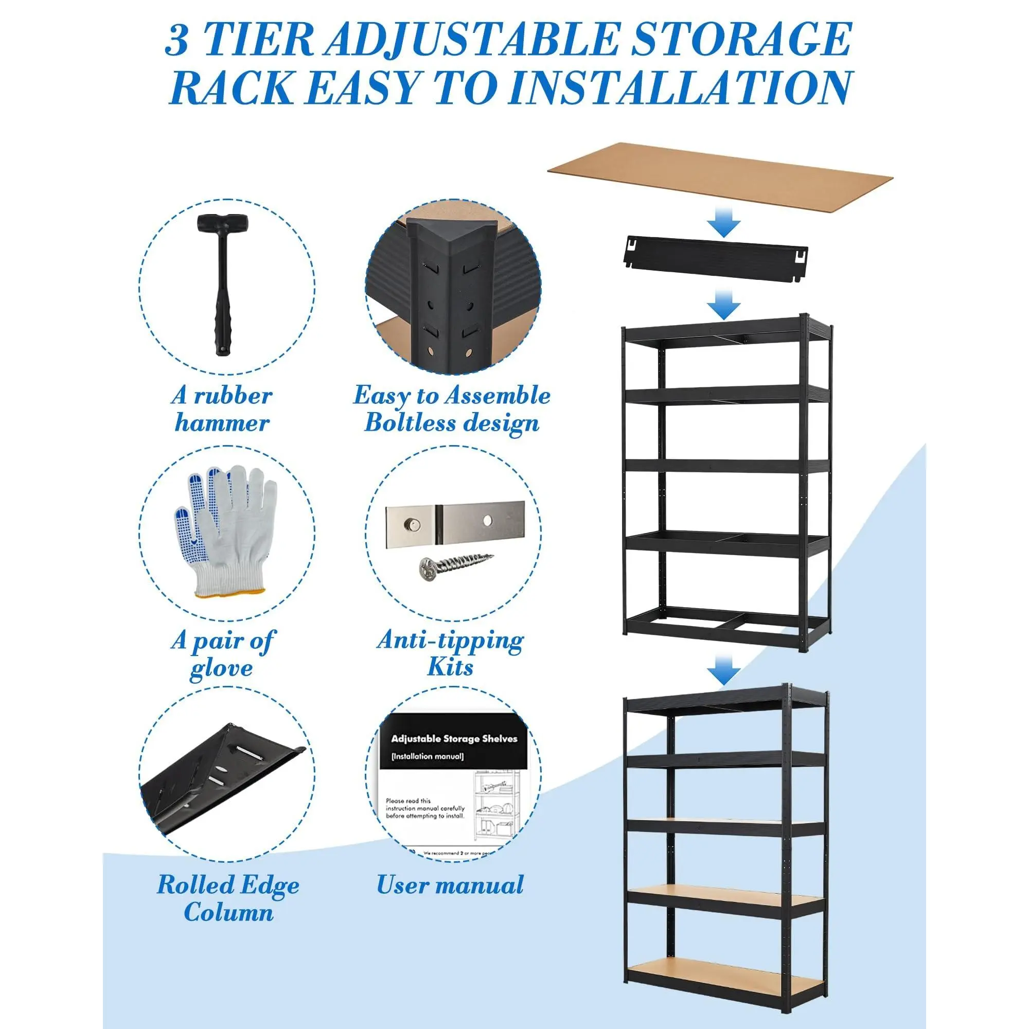 · Tool-Free Assembly & Easy Setup: Quick assembly metal shelves include all hardware, clear instructions, rubber mallet, and protective gloves. No tools needed for fast setup. Get your garage storage rack ready in minutes for immediate garage organization.