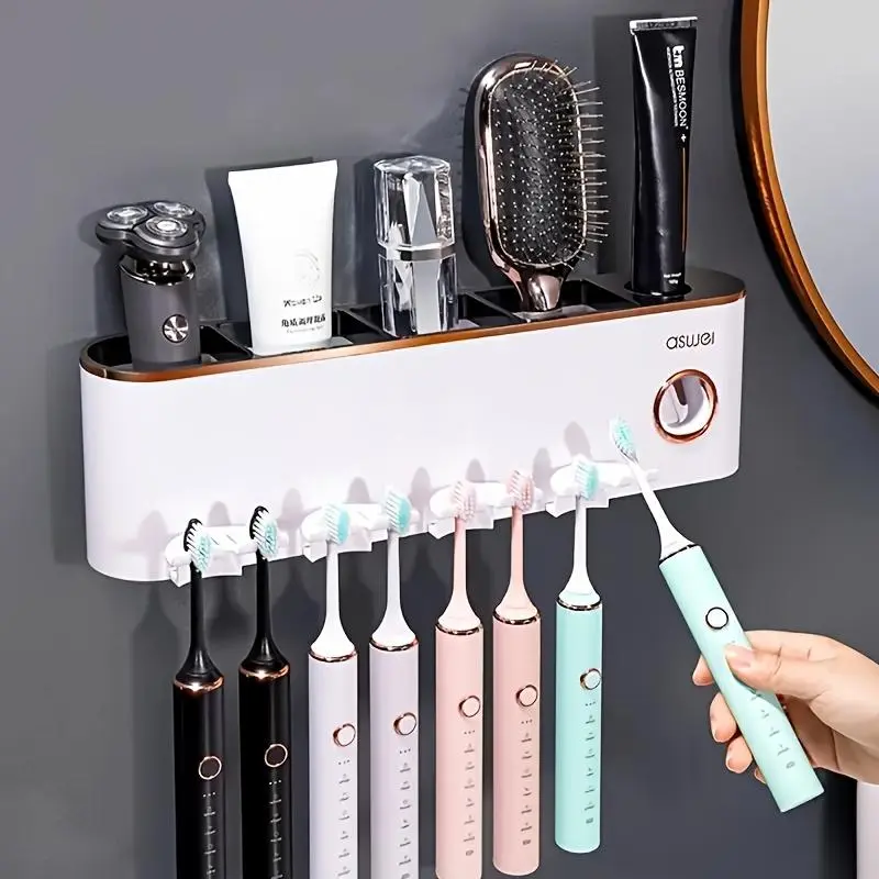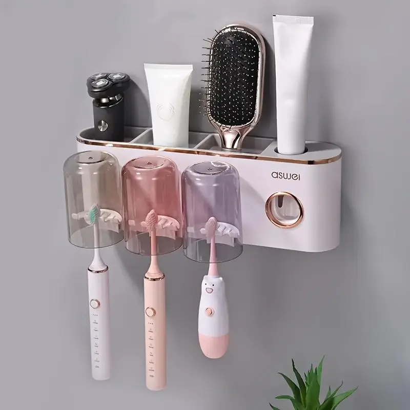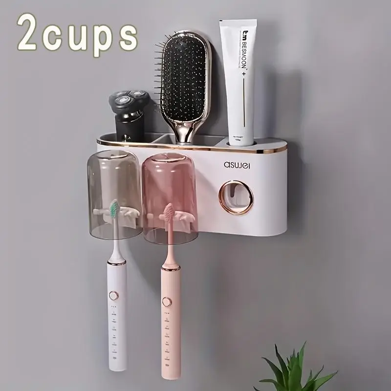 1 Wall-mounted Toothbrush Holder Set with Mouthwash Cup, No Need to Punch Holes, Automatic Toothpaste Dispenser, Wall-mounted Toothbrush Storage Rack, Bathroom Accessories, Plastic for Toothbrush, Toothpaste Tube and Mouthwash Cup