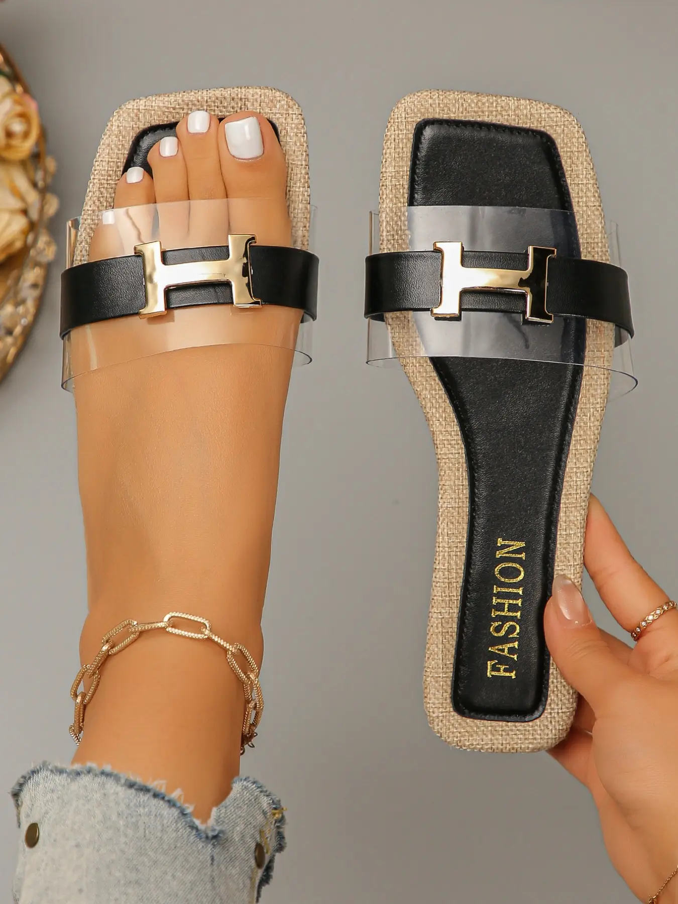 H Hook Sandals, Transparent Strap + Straw Sole, Slip-On Design, PU Leather Upper, Rubber Sole, Fashionable Stars Pattern, Less Than Ankle Height