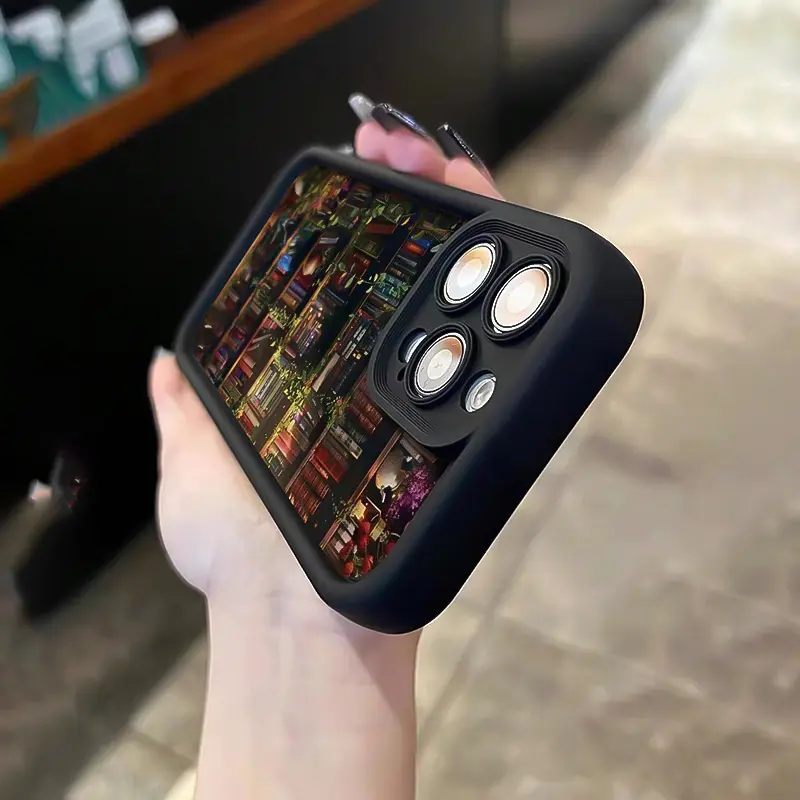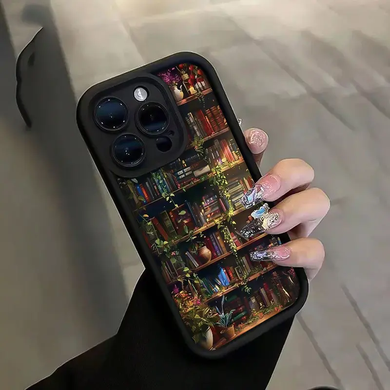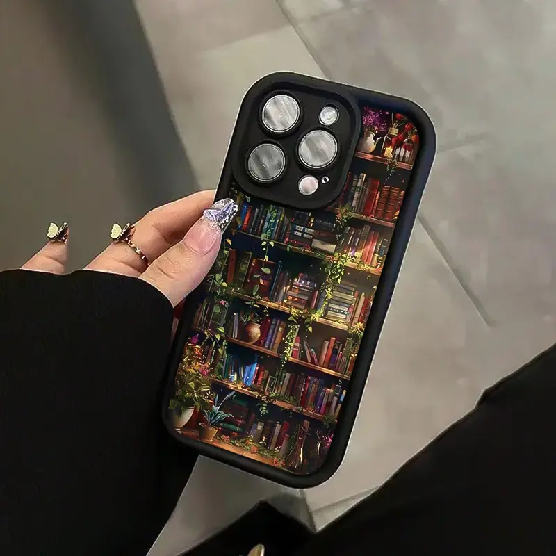 Phone case:Black Creative Bookshelf Book Pattern Anti-Drop Phone Case, Compatible with iiPhone 17 E Air Pro ProMax iPhone16 15 14 Plus 13 12 Mini 11 X XS XR, Aesthetic Black Phone Case, Birthday Gift for Boyfriend/Girlfriend, Cartoon Gift for Him and Her