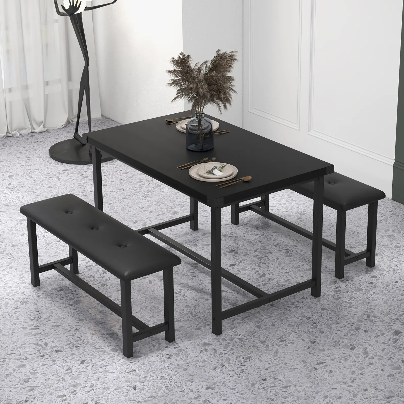 Bring efficiency and contemporary style to your dining area with this 3-piece Dining Table Set, expertly crafted for today’s compact homes and dynamic lifestyles. Designed to seat four comfortably, this set features a robust engineered wood tabletop and durable metal frame, ensuring lasting stability and support. The two upholstered benches, finished in easy-to-clean faux leather, slide neatly beneath the table to maximize floor space—ideal for apartments, condos, kitchen nooks, or studios.