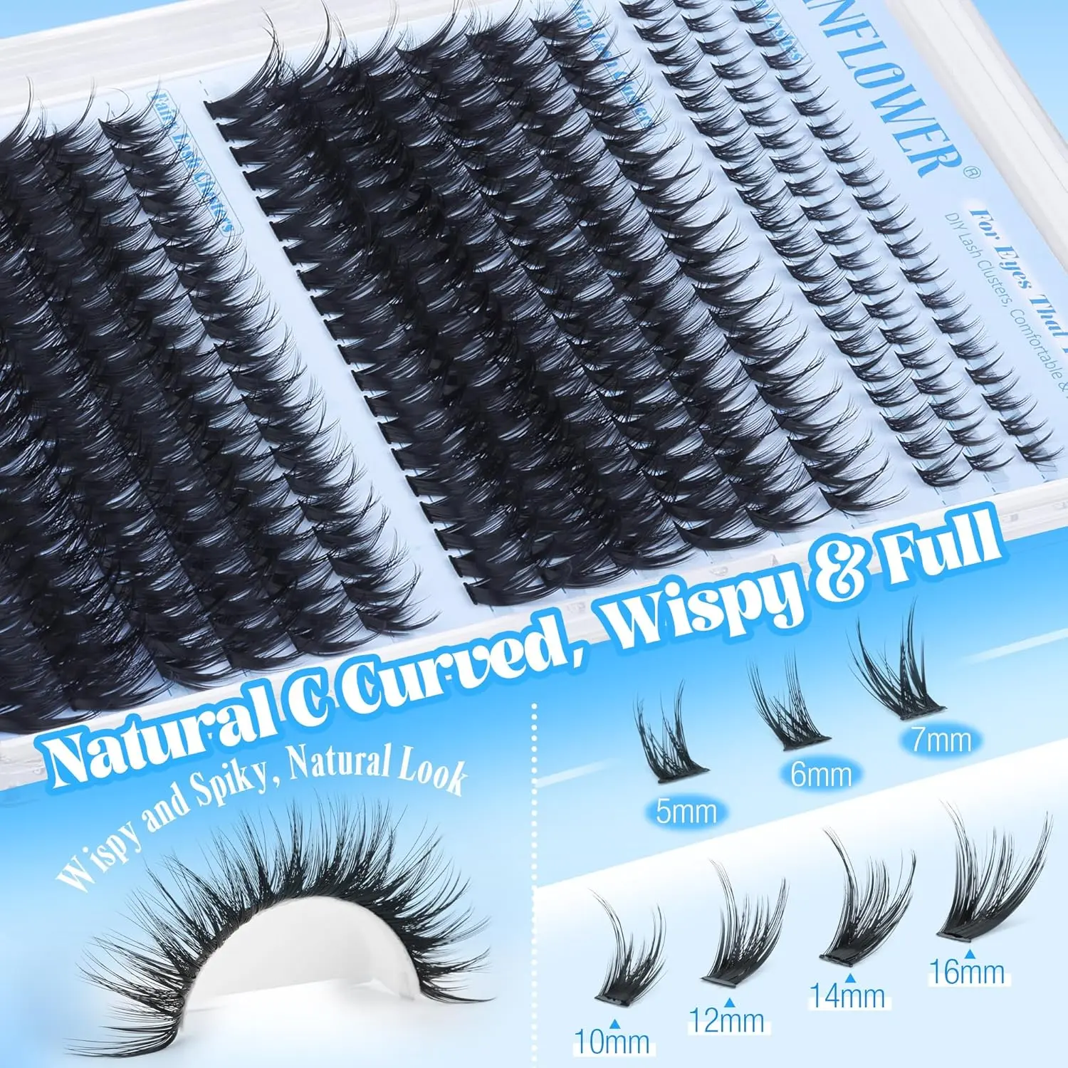 ·Natural, Fluttery Finish: Enhance your eyes with beautifully blended fairy and wispy lash clusters. The soft, wispy texture and c curve design provide a wide-eyed, wispy effect that seamlessly integrates with your own lashes for an undetectably gorgeous look.