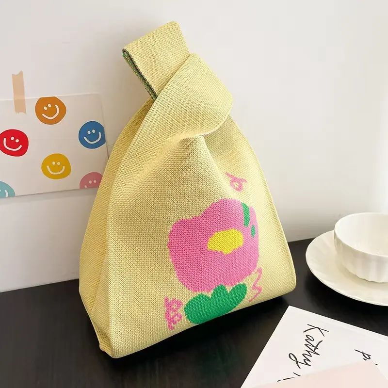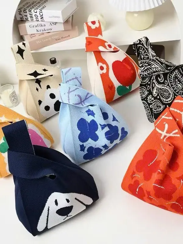 Mini knitted tote bag with cute printed design, small bucket handbag for carrying small items