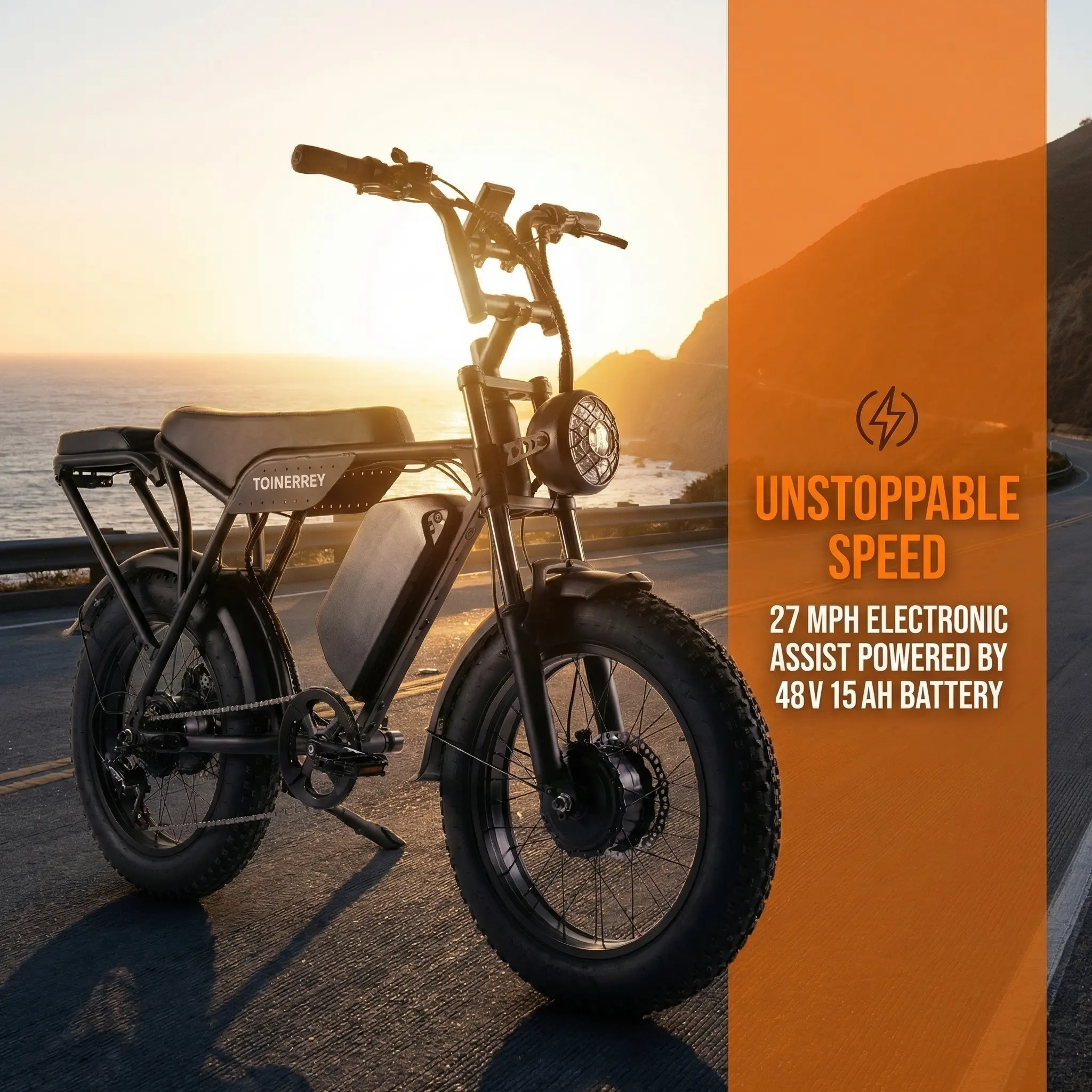 1500W peak motor and 28 MPH top speed make this e-bike perfect for steep hills. Conquer any terrain with ease. Ideal for daily commuting or off-road adventures. The 60V 15Ah removable battery offers a range of 50-80 miles per charge. Stay powered and ready for any journey.