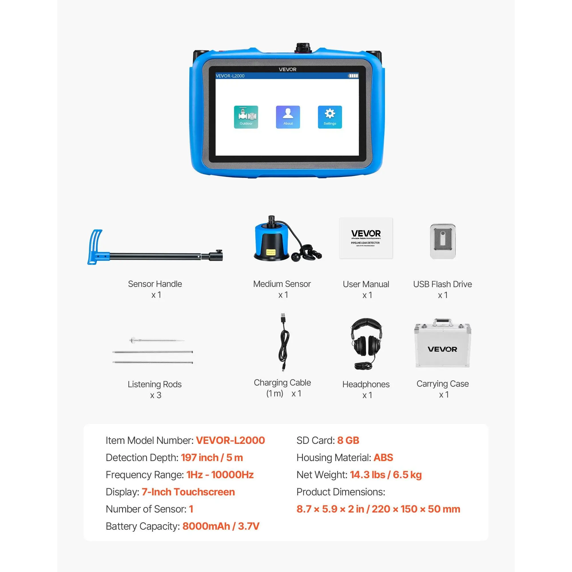 VEVOR pipe water leakage detector provides a 1Hz-10000Hz wide frequency range and 16.4FT (5m) detection depth. Equipped with a sensitive medium sensor, 3 listening rods, noise-canceling headphones, 7-inch touchscreen and 8000 mAh high-capacity battery for efficient leak detection.