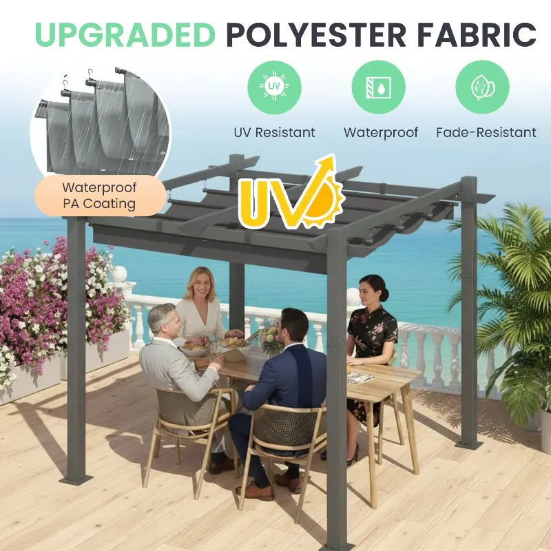 Versatile Spacious Design: This 10' × 10' pergola with a sunshade offers ample room for gatherings, barbecues, or quiet relaxation. It provides reliable shade and shelter while fitting well in outdoor areas such as patios or small courtyards, so you can enjoy relaxed outdoor living with family and friends.
