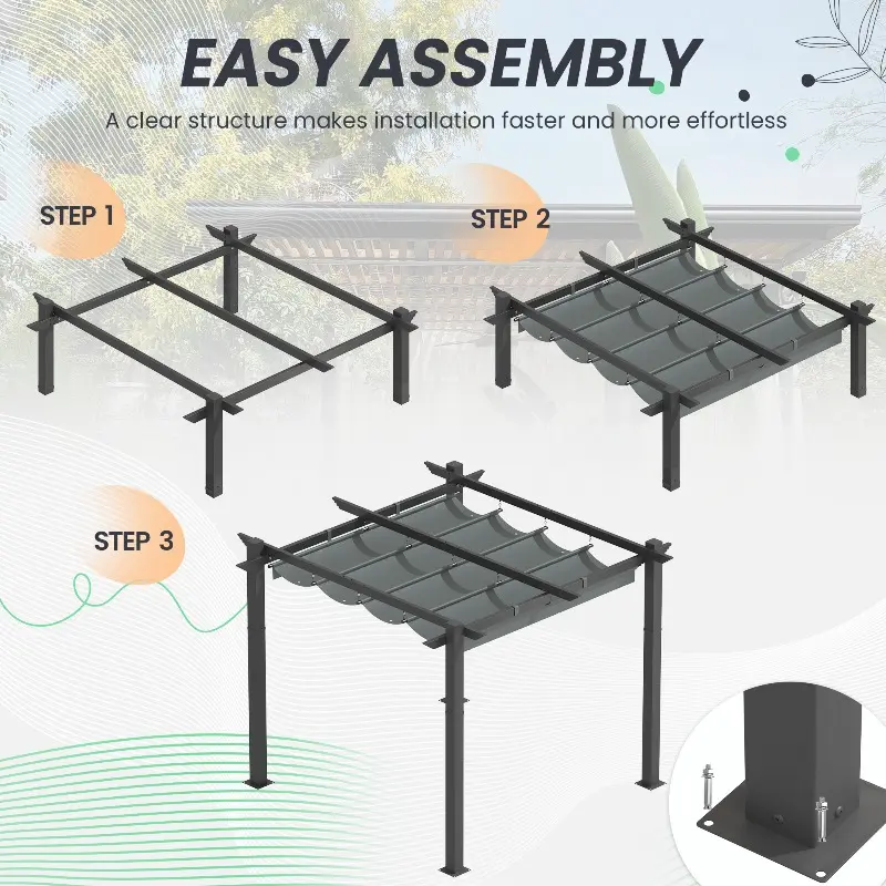 Easy Assembly: This outdoor pergola with canopy is designed for easy assembly. All components are pre-labeled and come with detailed, step-by-step illustrated instructions. We recommend assembling it on flat ground with multiple people. If you have any questions, contact us anytime.