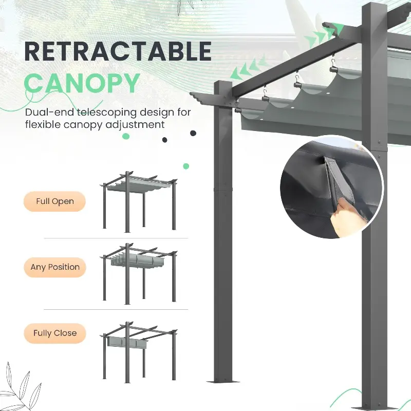 Sturdy Structure: Made of high-quality metal and a powder-coated finish, this patio pergola offers excellent rust and corrosion resistance. Ground stakes help secure it firmly to the ground, ensuring that the retractable pergola remains stable and retains its attractive appearance in all weather conditions.