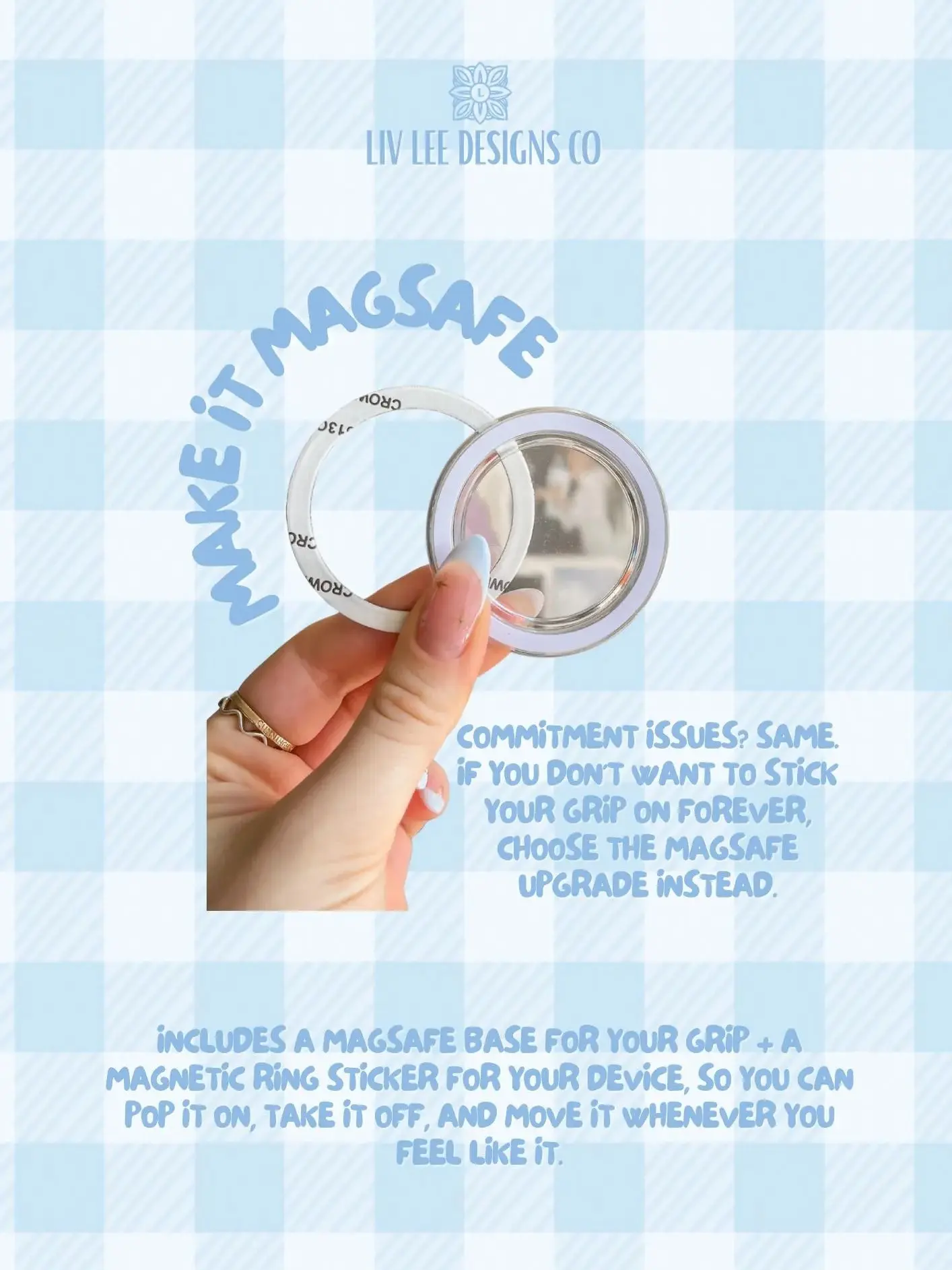 ✨ MagSafe Phone Grip Ideal for devices with magnetic support. – Strong magnetic base provides stable attachment – Easily snaps on/off with no residue – Compatible with MagSafe phones and cases