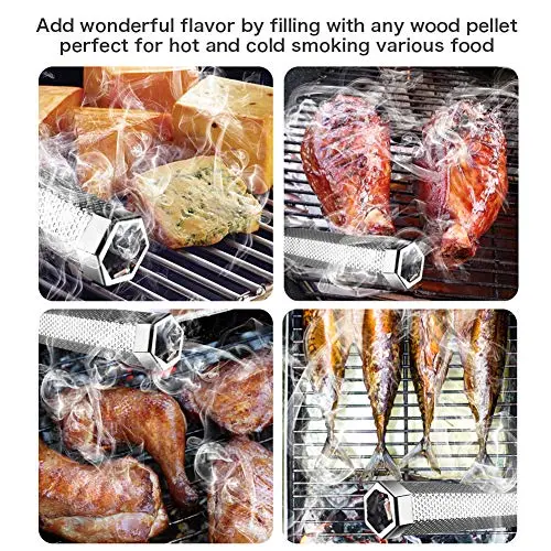 【IMPROVED DESIGN AND STAINLESS STEEL MATERIAL】 The special hexagonal smoker tube can stay steadily and will not roll on grill grate. Open cap at one end is for easy filling and lighting. Closed cap at other end keeps pellets inside. The whole smoker tube is made of high standard 304 grade stainless steel that is anti-rust and heat-resistant. With excellent workmanship, the smoker tube is very durable and will not be broken or bent after long-time use