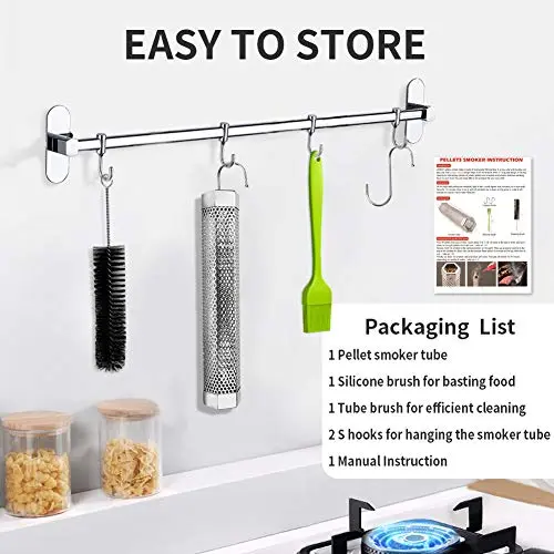 【IDEAL GIFT CHOICE】 The pellet smoker tube comes with bonus items: 1 silicone brush for basting food, 1 tube brush for efficient cleaning, and 2 S hooks for hanging the smoker tube. All of these are packaged well in a box. You can take it anywhere for outdoor use. The portable smoker tube set is a great gift idea.