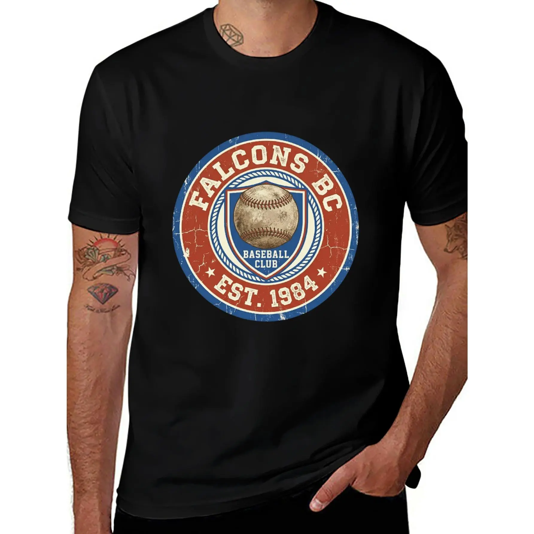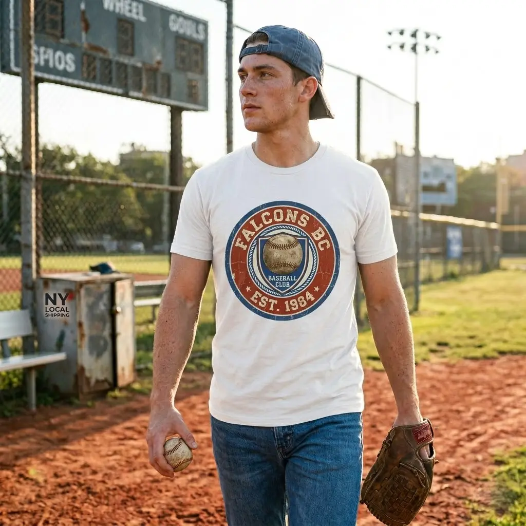 Step onto the field of style with our Vintage Falcons BC Baseball Tee. This design is a tribute to the golden era of varsity sports, featuring a beautifully distressed 1984 "Baseball Club" emblem. With its patriotic red, white, and blue palette and authentic weathered texture, this unique graphic is the perfect choice for fans of retro sportswear and timeless American aesthetics.